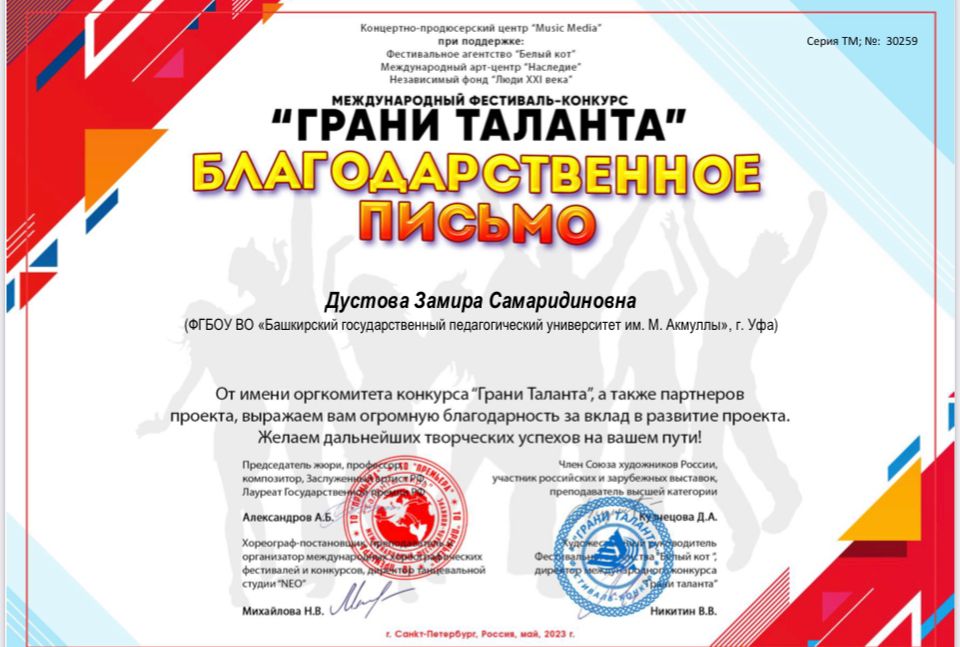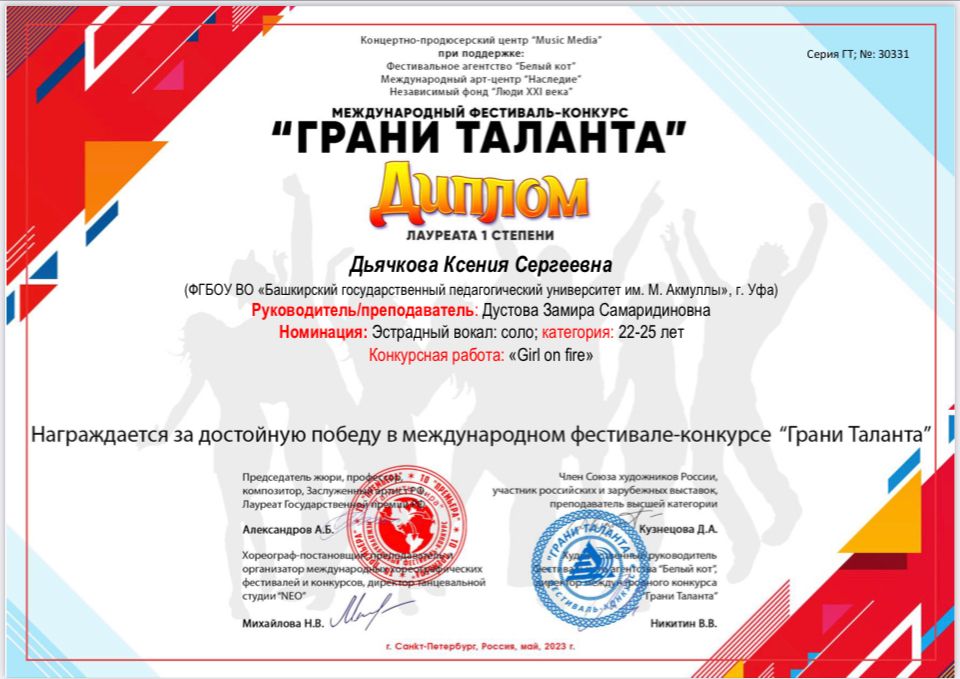 Студенты кафедры музыкального и хореографического образования Института педагогики БГПУ им. М. Акмуллы  вошли в число победителей Международного фестиваля -конкурса «Грани таланта», который проходил в г. Санкт-Петербург.