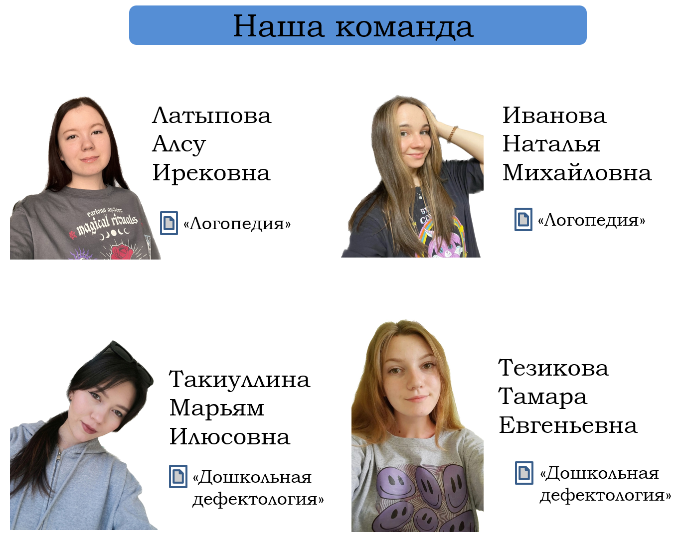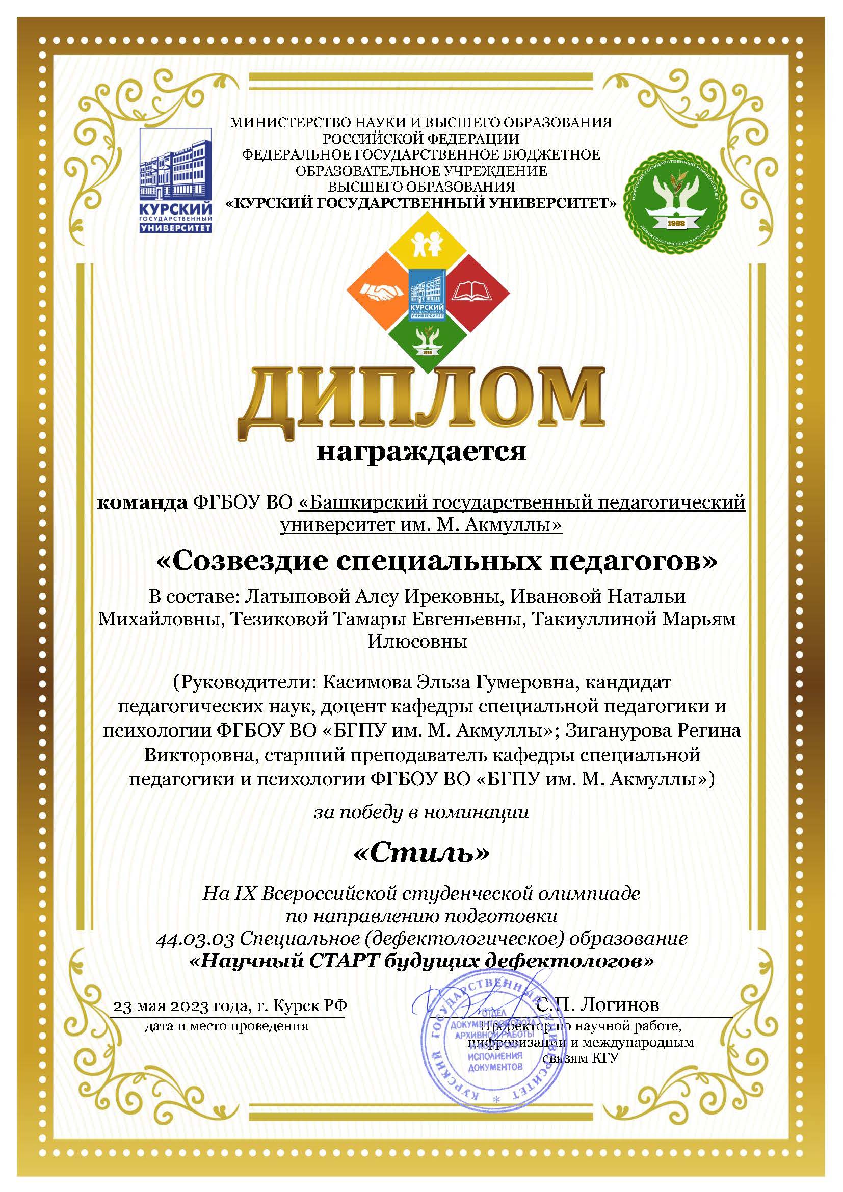 В мае 2023 года состоялась Всероссийская студенческая олимпиада «Научный старт будущих дефектологов», в которой активное участие приняли студенты 3 курса направления подготовки 44.03.03 «Специальное (дефектологическое) образование». В состав команды вошли: Иванова Наталья и Латыпова Алсу (гр. СОЛОГ-31-20), Тезикова Тамара и Такиуллина Марьям (гр. СОДД-31-20); научные руководители команды: доцент кафедры СПиП Касимова Э.Г. и старший преподаватель кафедры СПиП Зиганурова Р.В. Команда студентов Акмуллинского университета в условиях высокой конкуренции достойно представила наш вуз и победила в номинации «Стиль».