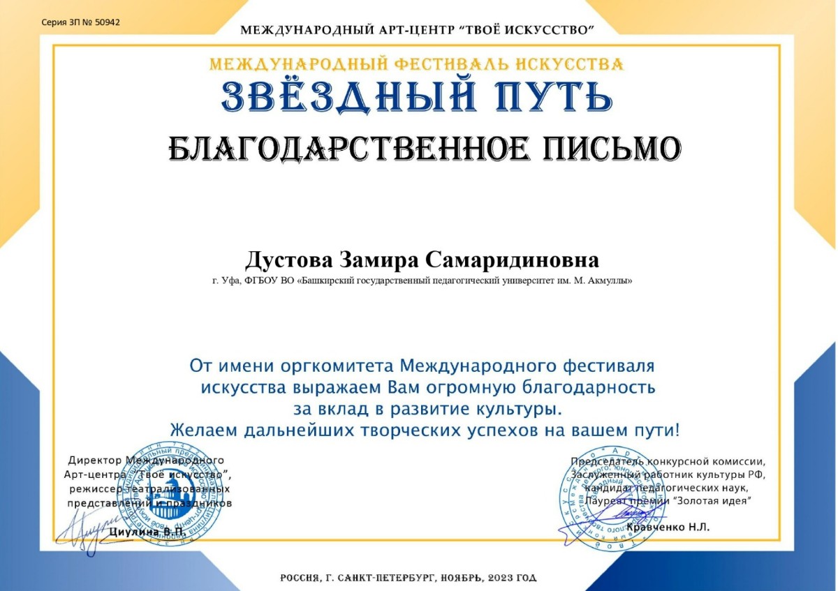 В ноябре 2023 года в г. Санкт-Петербург состоялся  Международный многожанровый конкурс детского, юношеского и взрослого творчества «Звездный путь», в котором приняли участие  студенты музыкального отделения кафедры музыкального и хореографического образования Института педагогики БГПУ им. М. Акмуллы.