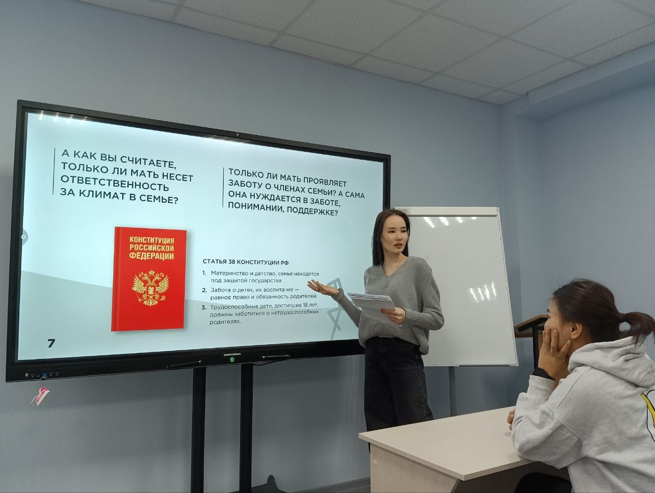 Далее студенты обсудили поддержку материнства и детства в нашем государстве, поделились представлениями о своей будущей семье. Все студенты активно высказали свою точку зрения. Далее был просмотрены видеоролики, в которых публичные личности вместе со своими семьями рассказывали о важности семьи в жизни человека, а именно о том, какими качествами должны обладать родители, о своем опыте семейных взаимоотношений и многом другом.