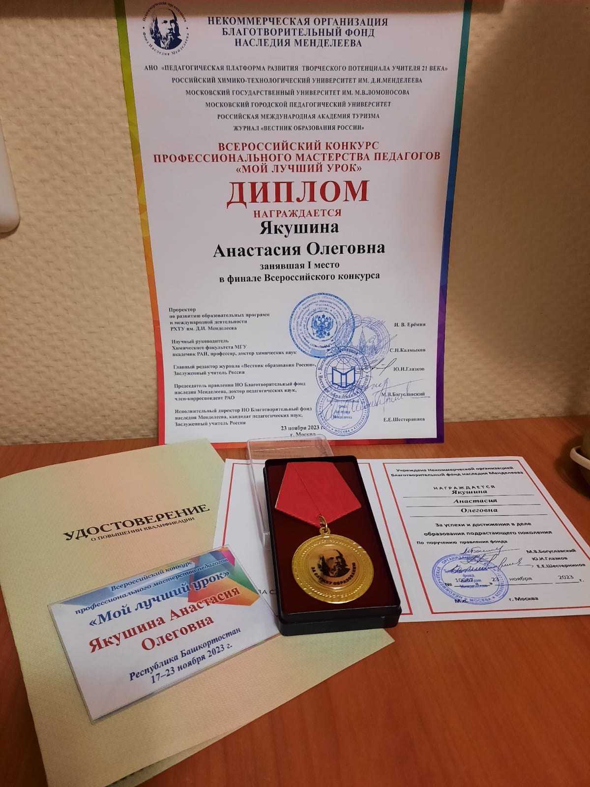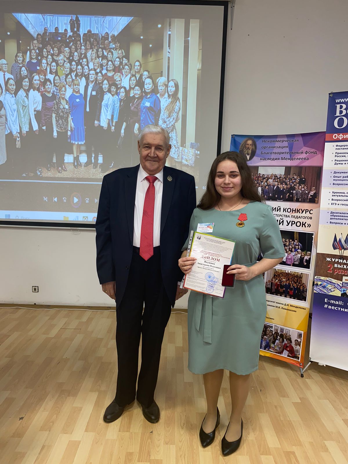 Якушина Анастасия Олеговна, студентка 1 курса Института педагогики, группы ОЗПВРИ-11-23 заняла 1 место во Всероссийском конкурсе профессионального мастерства педагогов "Мой лучший урок" и получила медаль "За службу образованию" от благотворительного фонда наследия Менделеева.