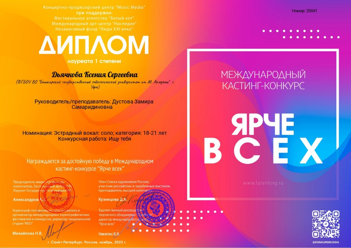 • Ксения Дьячкова -  диплом I степени в номинации «Вокальное искусство соло, эстрадный вокал»