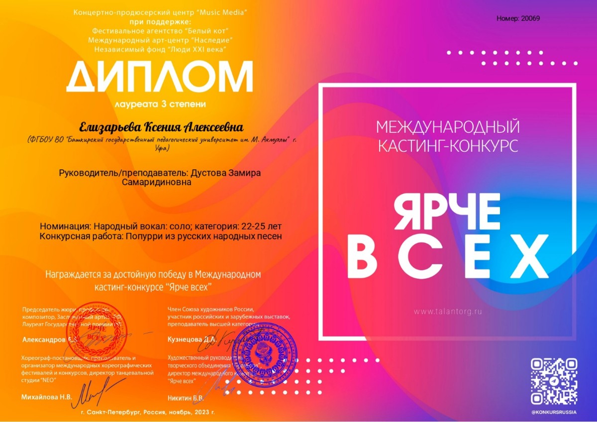 • Ксения Елизарьева – диплом III степени в номинации «Вокальное искусство соло, народный вокал»