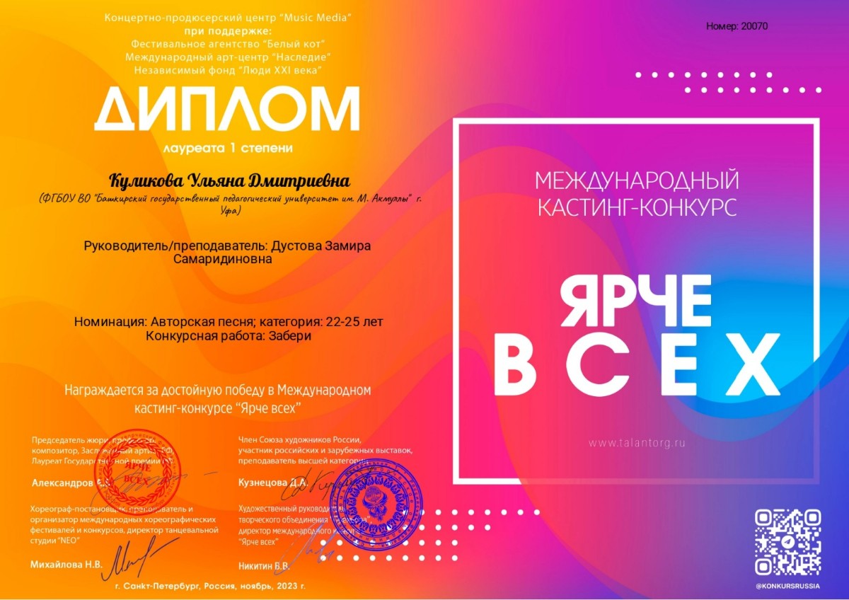 • Ульяна Куликова - диплом I степени в номинации «Вокальное искусство соло, авторская песня»