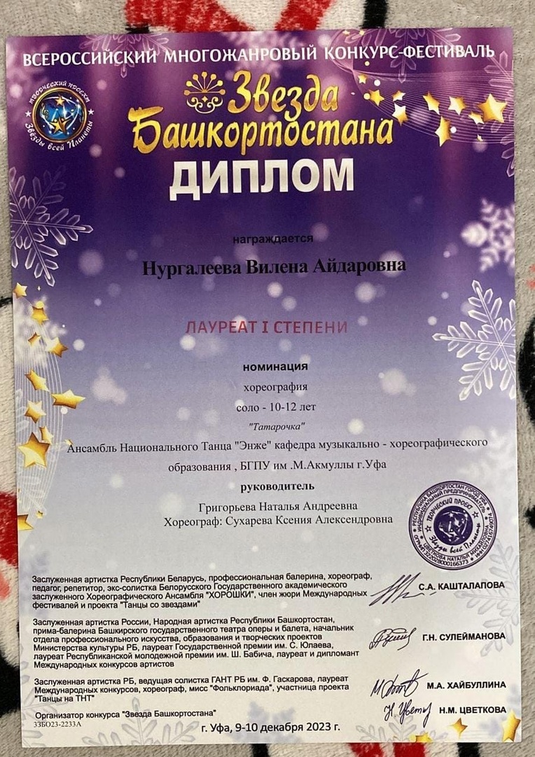 9 декабря 2023г. в г. Уфа Ансамбль ЭНЖЕ с раннего морозного утра, не взирая на - 40 градусов, принял участие в настоящем новогоднем конкурсе и стал «Звездой Башкортостана-2023». Это был очень насыщенный и длинный день для пяти групп. Ансамбль ЭНЖЕ получил самые достойные места!