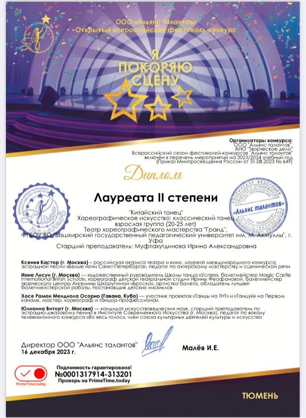 16 декабря 2023 года Театр хореографического мастерства «Гранд» под руководством старшего преподавателя Муфтахутдиновой И. А. принял участие в III Всероссийском фестивале-конкурсе "Я покоряю сцену" (г.Тюмень, 2023) с китайским танцем и стал лауреатом 2 степени.