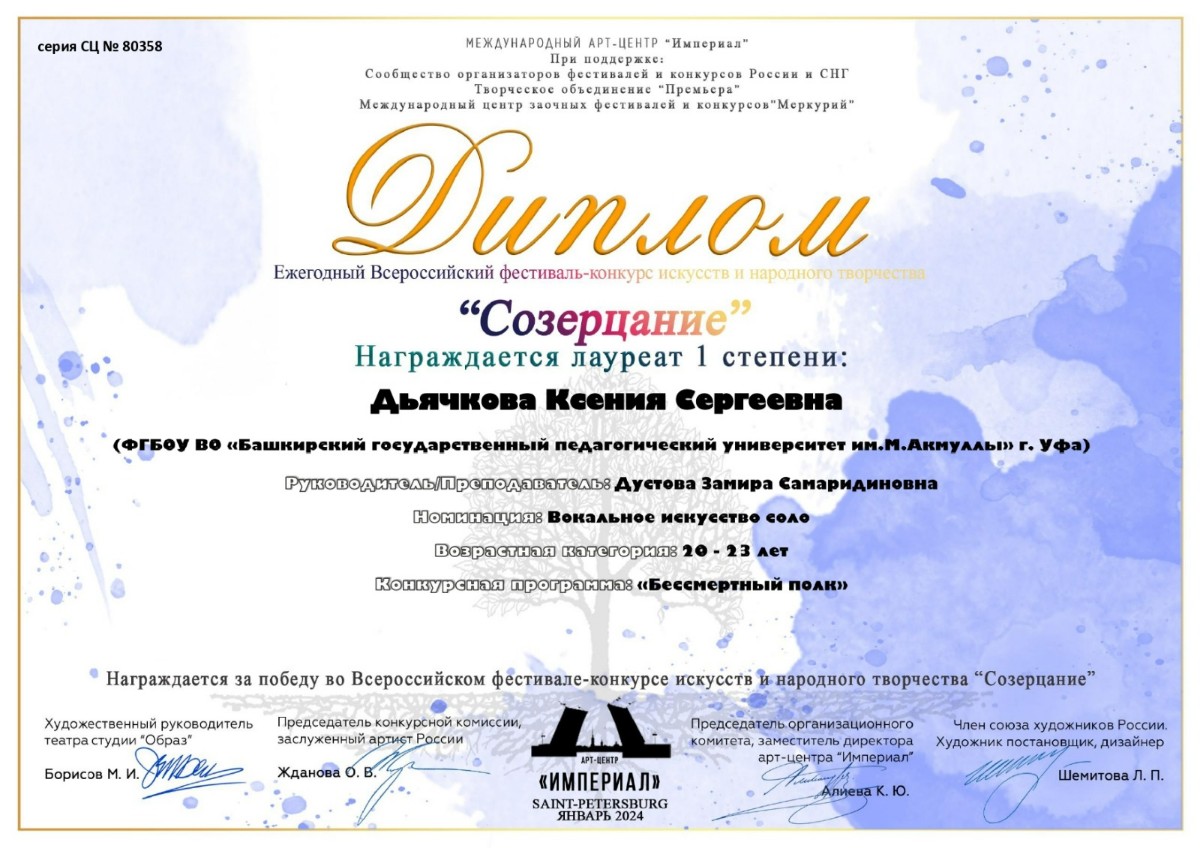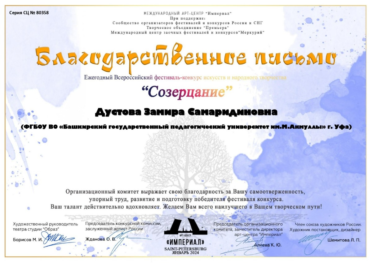 ​Студентка Института педагогики Акмуллинского университета вошла в число победителей Всероссийского фестиваля-конкурса искусств и народного творчества «Созерцание»