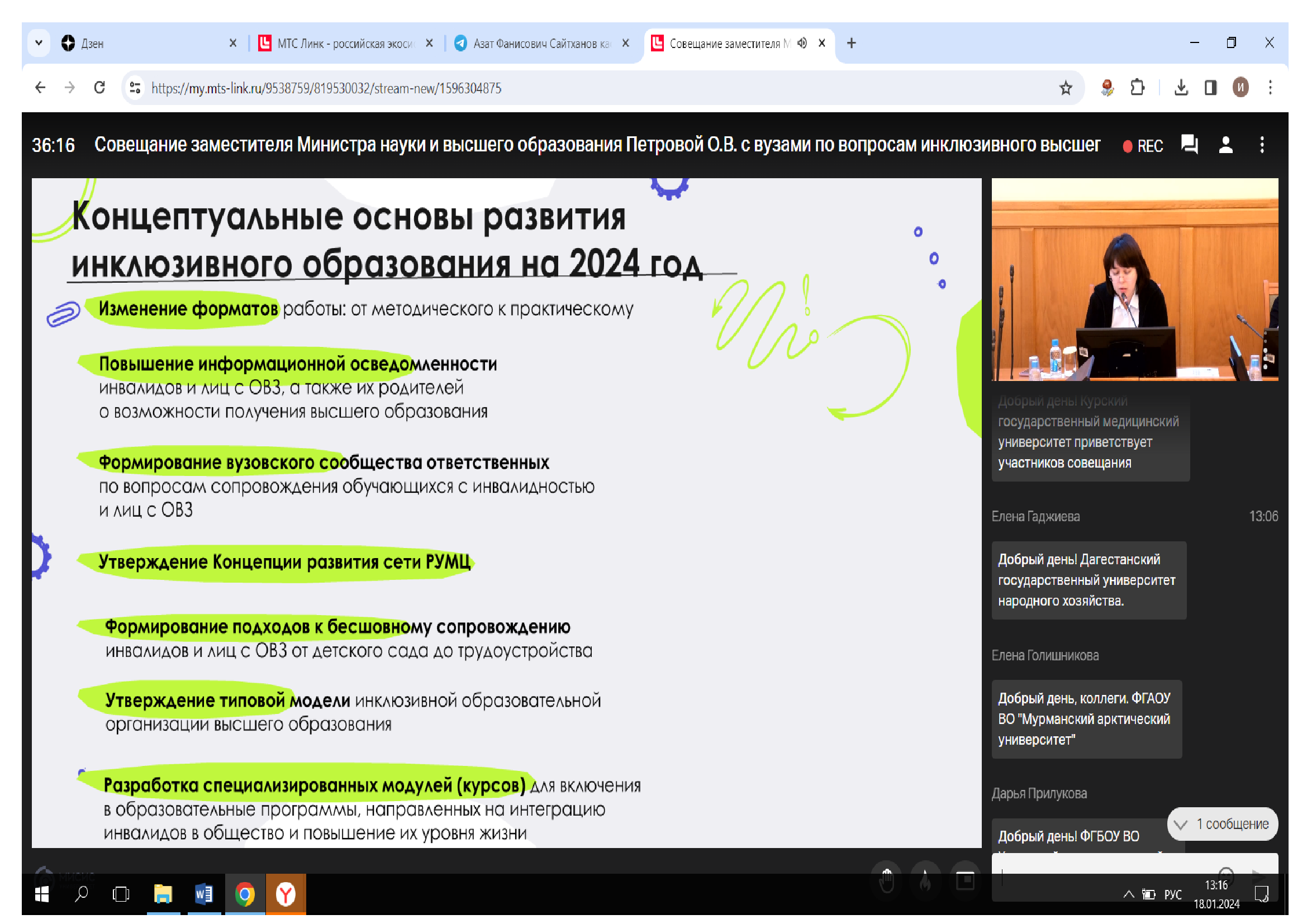 18 января 2024 года под председательством заместителя Министра науки и высшего образования Петровой О.В. состоялось совещании по вопросам развития инклюзивного высшего образования в РФ, в котором приняла участие зав. кафедрой СПиП Цилюгина И.Б.