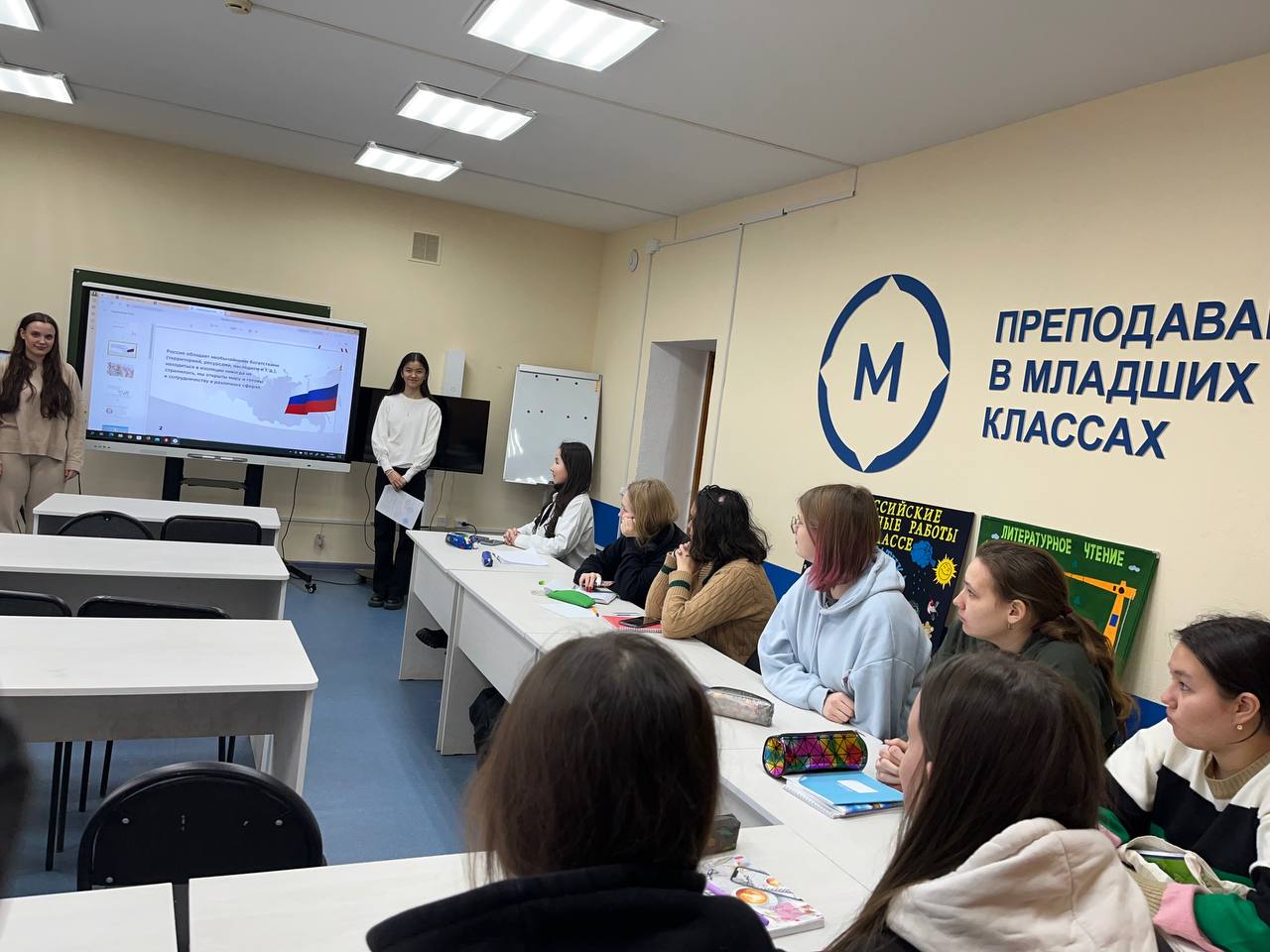 29 января 2024 года в рамках просветительских мероприятий «Разговор о важном» для студентов 1 курсов, обучающихся по направлению Педагогическое образование профиль Начальное образование, была организована беседа на тему "Союзники России".      В качестве докладчика выступили студентки 2 курса направления Педагогическое образование профиль Начальное образование Елизавета Егорова и Тахмина Рысбаева (руководитель – Е.А. Савельева, к.п.н., доцент кафедры ТиМНО).
