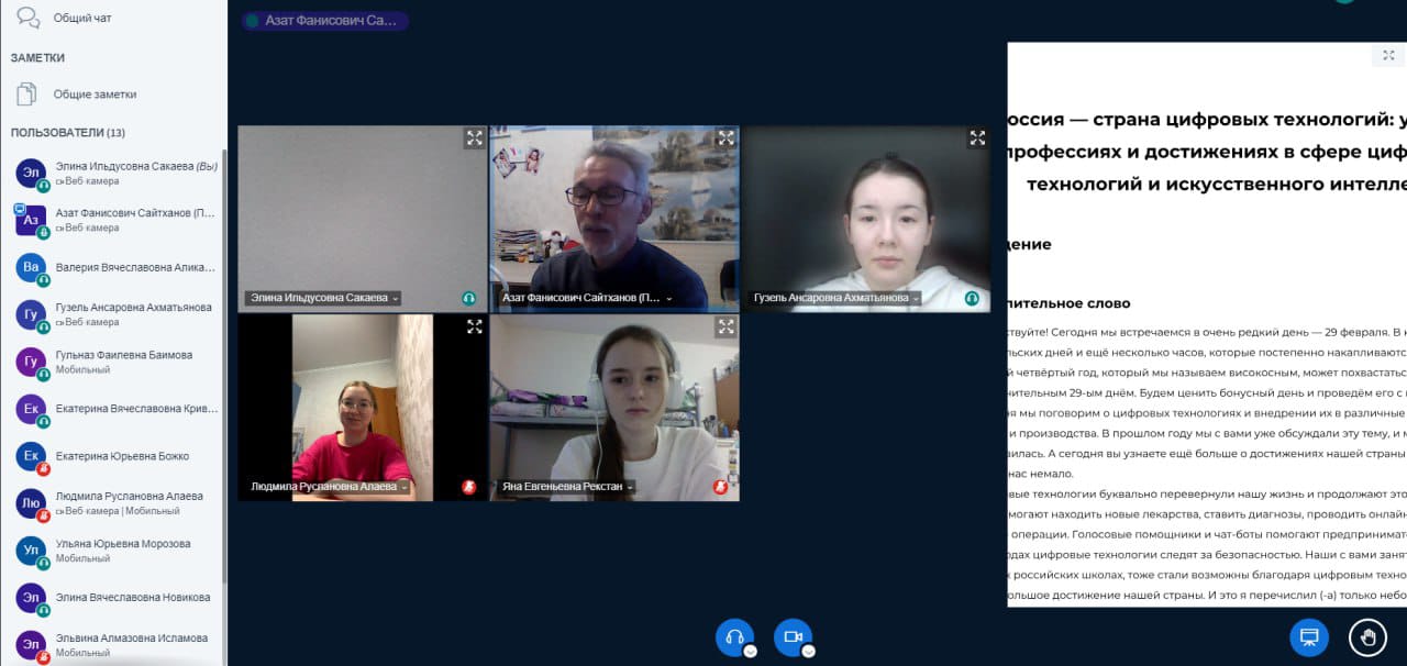 29 февраля 2024 года в рамках Всероссийского просветительского проекта «Россия - мои горизонты»» со студентами групп СОЛОГ-11-23, СОДД-11-23, СОЛОГ-21-22, СОДД-21-22, СОЛОГ-31-21, СОДД-31-21 ст. преподаватели кафедры СПиП Дильмухаметова Р.С., Зиганурова Р.В. доценты кафедры СПиП Касимова Э.Г., Сайтханов А.Ф., Сайфутдиярова Е.Ф., Фатихова Л.Ф. провели профориентационное занятие на тему «Россия – страна цифровых технологий: узнаю о профессиях и достижениях в сфере цифровых технологий и искусственного интеллекта». Студенты и преподаватели обсудили вопросы, связанные с внедрением цифровых технологий в различные области жизни и производства, наглядно увидели, как сильно изменились некоторые области, и как разработки наших специалистов помогли упростить многие процессы, обсудили карту профессий в области цифровых технологий, узнали о перспективах отрасли. Цифровизация дала жителям России много возможностей. А в будущем наши специалисты намерены внедрять искусственный интеллект во многие области и повышать уровень кибербезопасности.