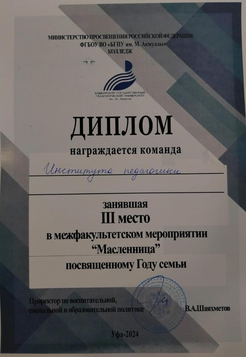 14 марта 2024 года на площади перед БГПУ им.М.Акмуллы прошли Масленичные гуляния. Старинный народный праздник студенты Института педагогики  отметили веселыми играми и забавами, бегали в мешках, участвовали в битве подушками, метали валенок и кидали «снежки». Победители получали «акмуллинки» - специальные билеты, которые можно было обменять на вкусное угощение. Студенты увлекательно провели время, угощались блинами. Завершился праздник розыгрышем лотереи среди участников праздника и награждением команд факультетов и институтов.  Команда Института педагогики заняла третье место! Поздравляем и выражаем благодарность за участие в мероприятии.
