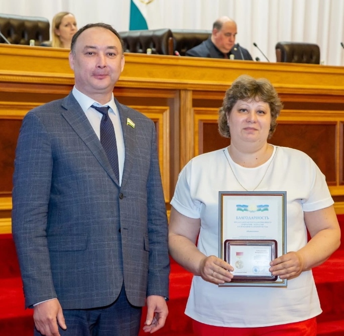 Ей вручена Благодарность  Председателя Государственного Собрания- Курултая Республики Башкортостан за большой вклад в развитие инженерно-технического образования детей и молодежи в Республике Башкортостан, за поддержку Олимпиады на кубок имени Ю.А.Гагарина.