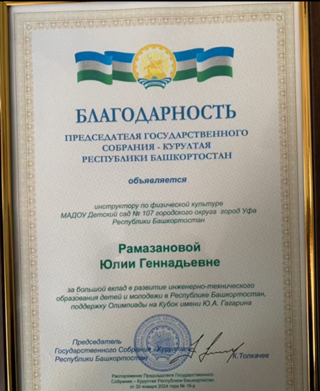 Благодарность Председателя Государственного Собрания- Курултая Республики Башкортостан за большой вклад в развитие инженерно-технического образования детей и молодежи в Республике Башкортостан, за поддержку Олимпиады на кубок имени Ю.А.Гагарина