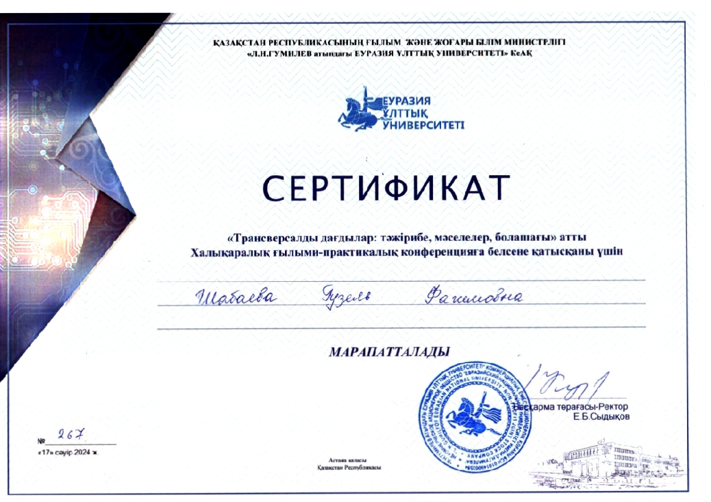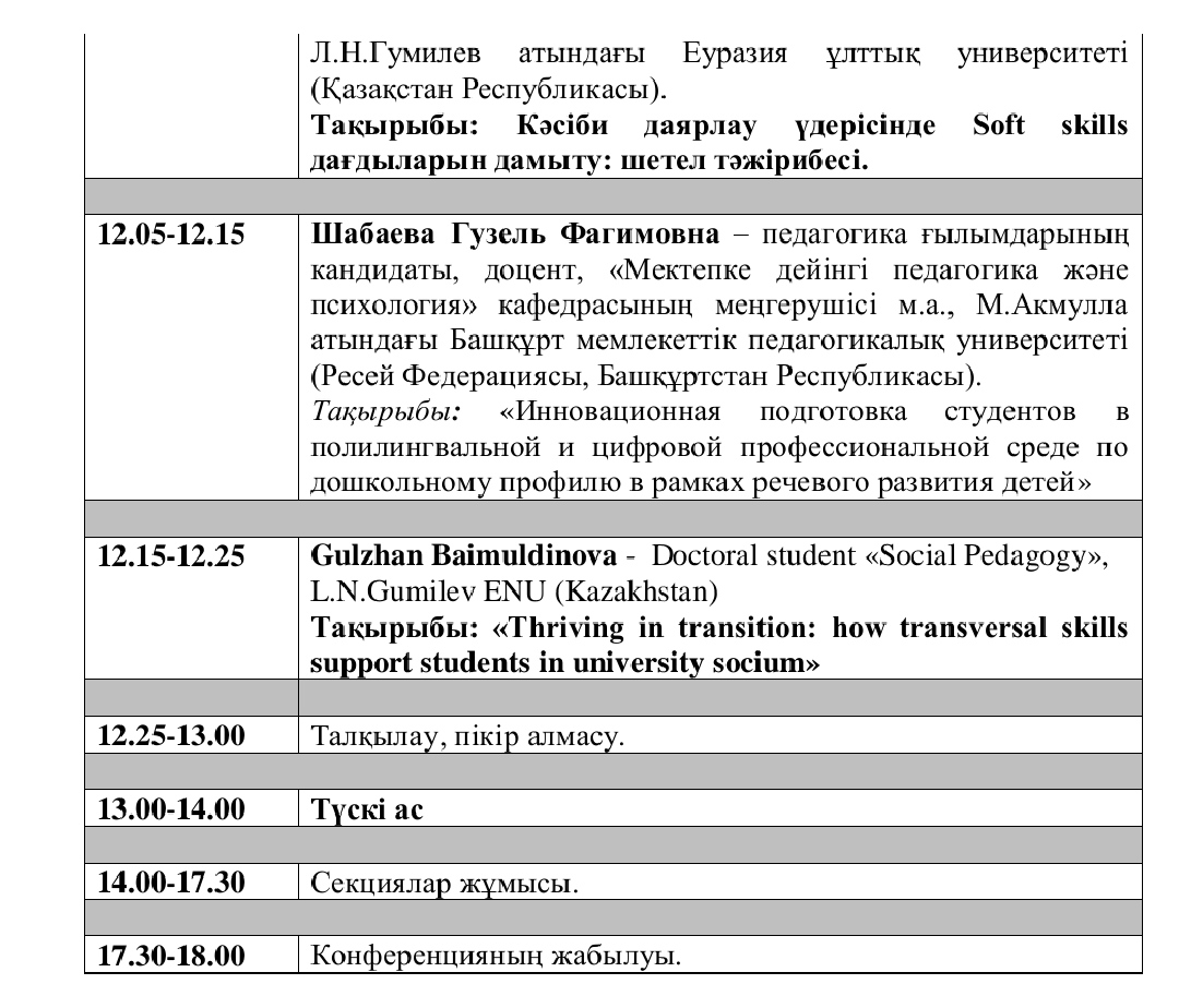 17.04.2024 Шабаева Г.Ф., к.п.н., доц., и.о. зав.каф.ДПиП Института педагогики БГПУ имени Мифтахетдина Акмуллы выступила с докладом на Международной научно-практической конференции "Трансверсальные навыки: опыт, проблемы, перспективы" г. Астана Казахстан