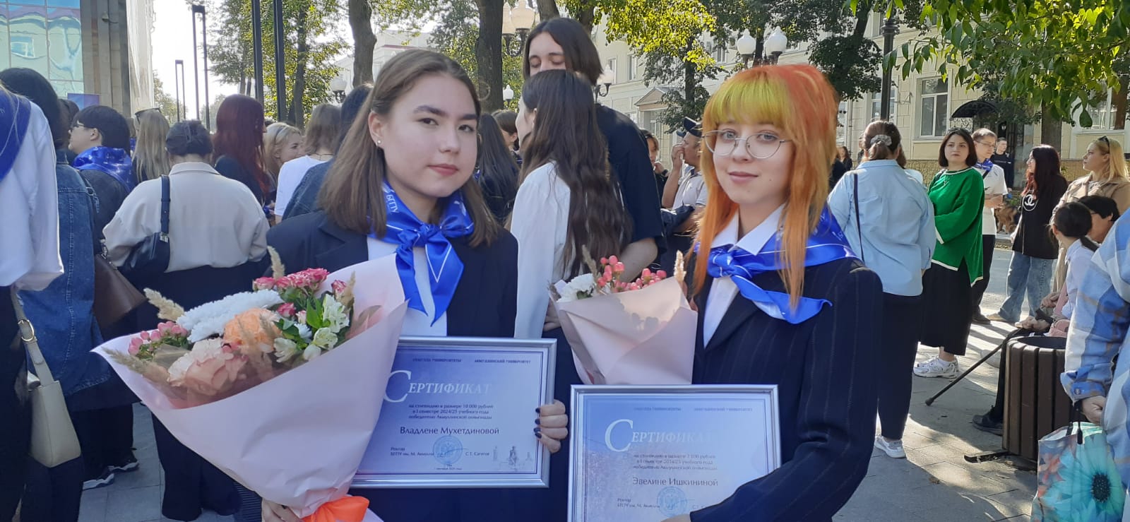 Восемь первокурсников, ставших в прошедшем учебном году победителями и призерами Акмулллинской олимпиады, получили из рук ректора сертификаты на выплату в течение первого семестра специальной стипендии. Обладателями ее стали 2 первокурсницы кафедры специальной педагогики и психологии Эвелина Ишкинина и Владлена Мухетдинова.