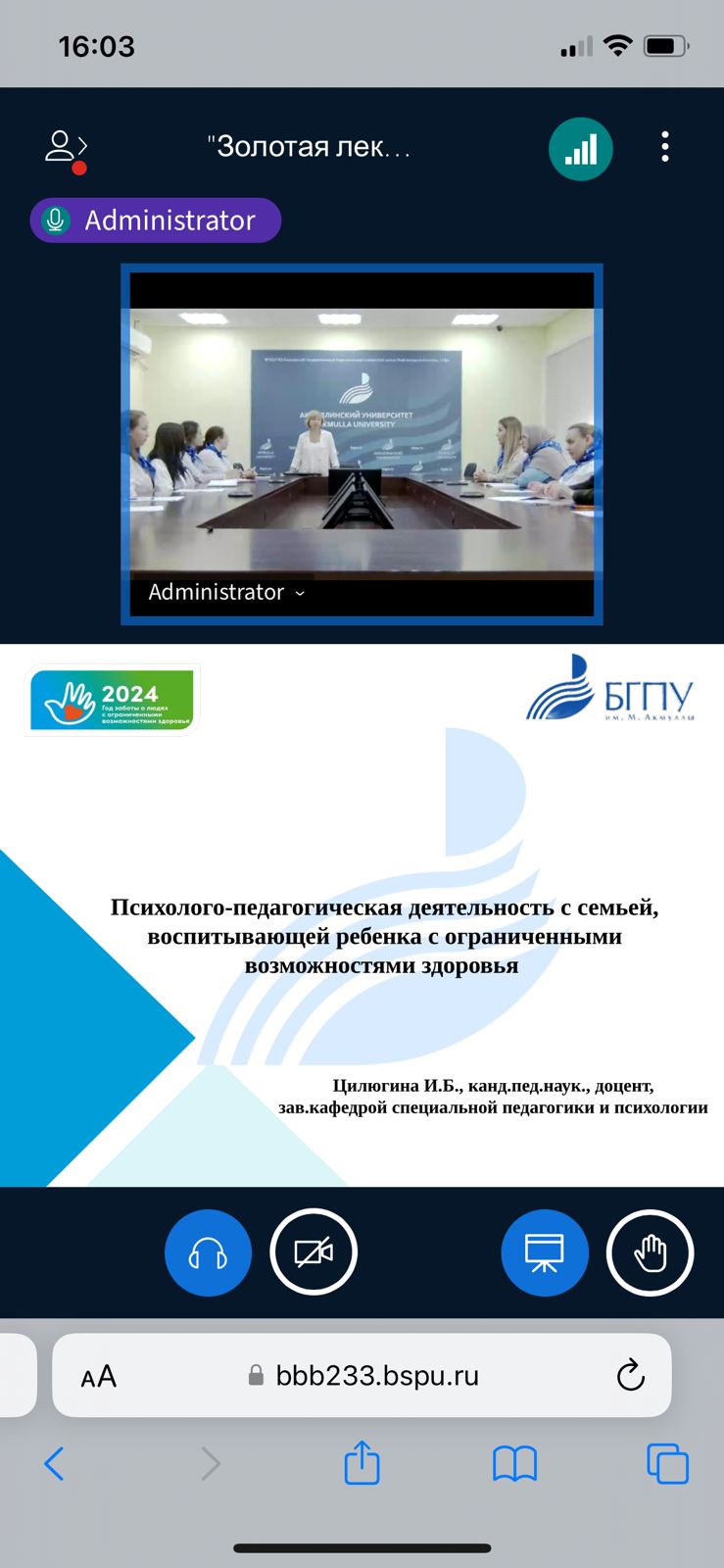 В рамках реализации международного просветительского онлайн проекта «Золотая лекция» профессорско-преподавательского состава вузов-партнеров Содружества Независимых Государств, проводимого под эгидой Общественного совета МПГУ по подготовке педагогических кадров государств-участников стран СНГ, канд.пед.наук, доцент, зав.кафедрой специальной педагогики и психологии Башкирского государственного педагогического университета имени М.Акмуллы Цилюгина И.Б. провела лекцию на тему: «Психолого-педагогическая деятельность с семьей, воспитывающей ребенка с ограниченными возможностями здоровья». Ирина Борисовна осветила трудности и проблемы, испытываемые семьей, воспитывающей ребенка с ограниченными возможностями здоровья, вместе со студентами группы ППОСП-41-21 выявила потребности такой семьи, как источник отбора содержания психолого-педагогической деятельности, уточнила методы диагностики, используемые специалистами в психолого-педагогической работе с семьей, воспитывающей ребенка с ограниченными возможностями здоровья, а также осветила опыт Республики Башкортостан и Акмуллинского университета по психолого-педагогической деятельность с семьей, воспитывающей ребенка с ограниченными возможностями здоровья.