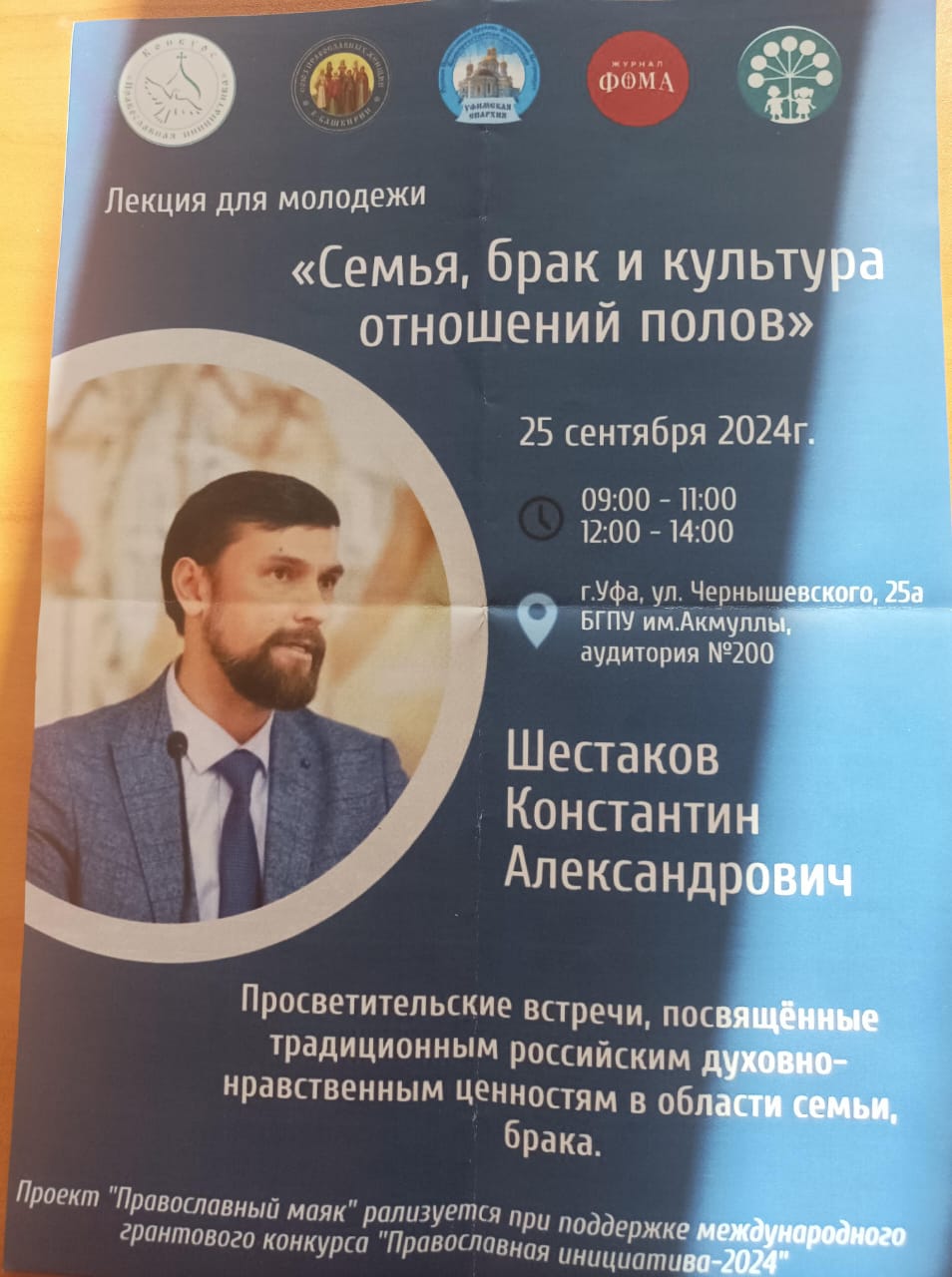 25 сентября 2024 года студенты 2 и 3 курсов кафедры специальной педагогики и психологии приняли участие в просветительской лекции «Семья, брак и культура отношений полов». Спикерами выступили руководитель лекционного направления «Спаси Жизнь», заместитель председателя и лектор Центра защиты материнства «Покров», лауреат конкурса «Серафимовский учитель – 2018-2019», отец пятерых детей, кандидат социологических наук, специалист по аксиологии, социологии семьи и демографии Константин Шестаков и протоиерей отдела благотворительности и социального служения Уфимской епархии Вячеслав Архангельский.
