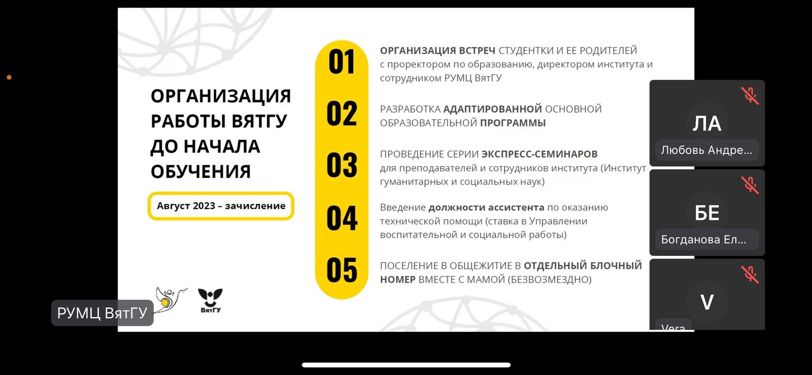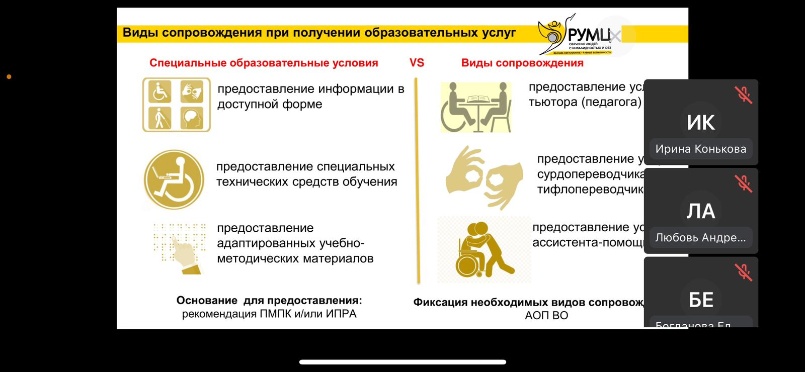 На вебинаре были рассмотрены основные понятия и организационные решения сопровождения, а также представлены лучшие практики сопровождения студентов с инвалидность в вузе. Участники вебинара обсудили следующие вопросы: сопровождение лиц с инвалидностью и ОВЗ в вузе: основные понятия, организационные и практические решения; сопровождение студента с нарушением зрения в вузе; организация сопровождения обучения студента с нарушением ОДА в вузе; индивидуальное сопровождение студента с нарушением ОДА в вузе с привлечением специалиста по социальной работе.