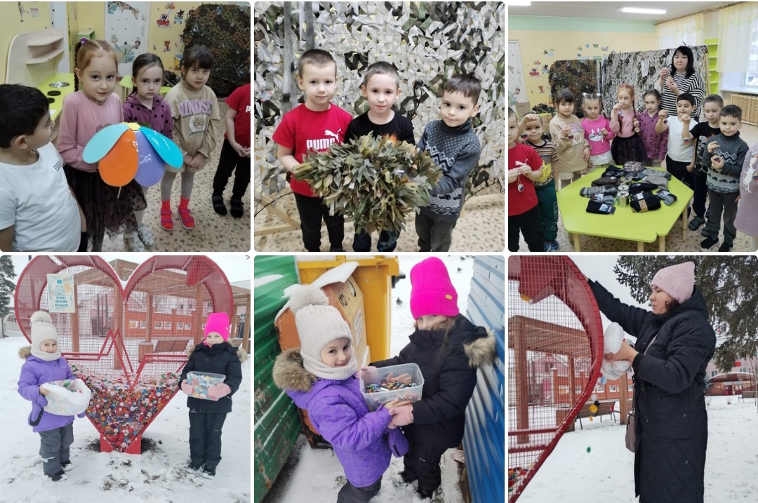 Девочки и мальчики вместе с родителями регулярно участвуют в акции "Усы, лапы, хвост" (приносят корм для кошек и собак, находящихся в приюте), собирают крышки и батарейки для дальнейшей утилизации, пишут письма, отправляют рисунки и поделки для участников СВО.