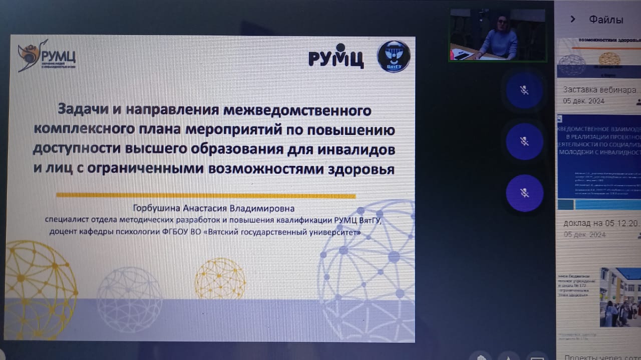 5 декабря РУМЦ ВятГУ провел межведомственный семинар-совещание по актуализации задач и направлений региональных межведомственных комплексных планов мероприятий по повышению доступности СПО и ВО для инвалидов и лиц с ОВЗ в рамках реализации мероприятий, направленных на укрепление межведомственного взаимодействия по вопросам доступности инклюзивного образования.