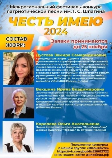 В декабре 2024 г. доцент кафедры музыкального и хореографического образования Замира Дустова приняла участие в качестве председателя жюри в XVIII Межрегиональном фестивале-конкурсе патриотической песни «Честь имею» им. Г.С. Шпагина, который прошел в г. Вятские Поляны.