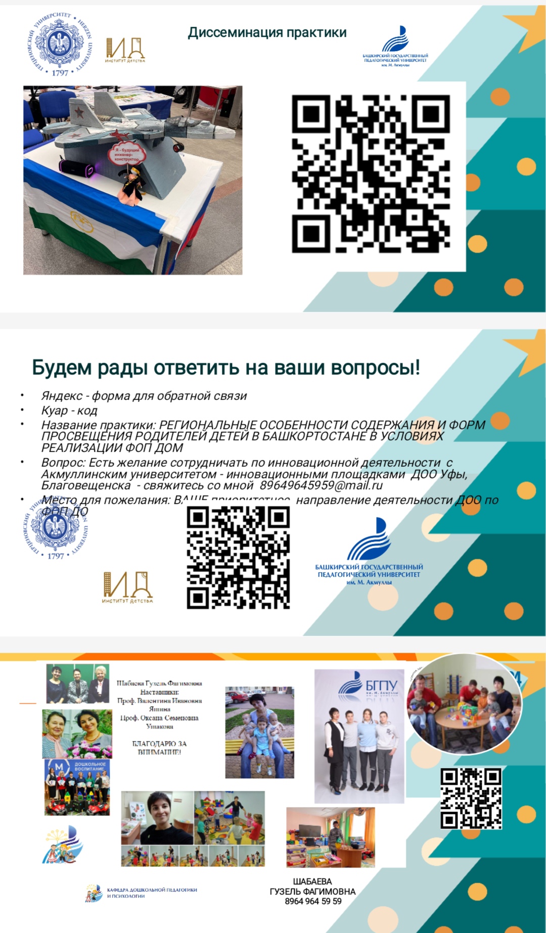 В выступлении Шабаевой Г.Ф. представлен опыт инновационной подготовки будущих педагогов колледжа и вуза в условиях единого образовательного пространства в РФ по реализации Родительского просвещения в регионе, опыт подготовки родительского сообщества, студентов на базе центра развития компетенций «Акмуллинская академия развития детей и семейного образования СОТЫ». Проекты кафедры ДПиП ВУЗа, колледжа БГПУ в лицах, в событиях, в цифрах. Инновационные инструменты и технологии развития дошкольников, процесса становления студентов как профессионалов в интерактивном портфеле педагога ДОО, ППС кафедры в условиях преемственности ДО и НОО в рамках взаимодействия ДОО и семьи. Деятельность инновационных площадок кафедры ДПиП в области Родительского просвещения. Обзор и краткая характеристика лучших практик реализации и методического сопровождения ФОП ДО по сохранению и развитию традиционных семейных ценностей в ДО Республики Башкортостан в сетевом взаимодействии с регионами РФ.
