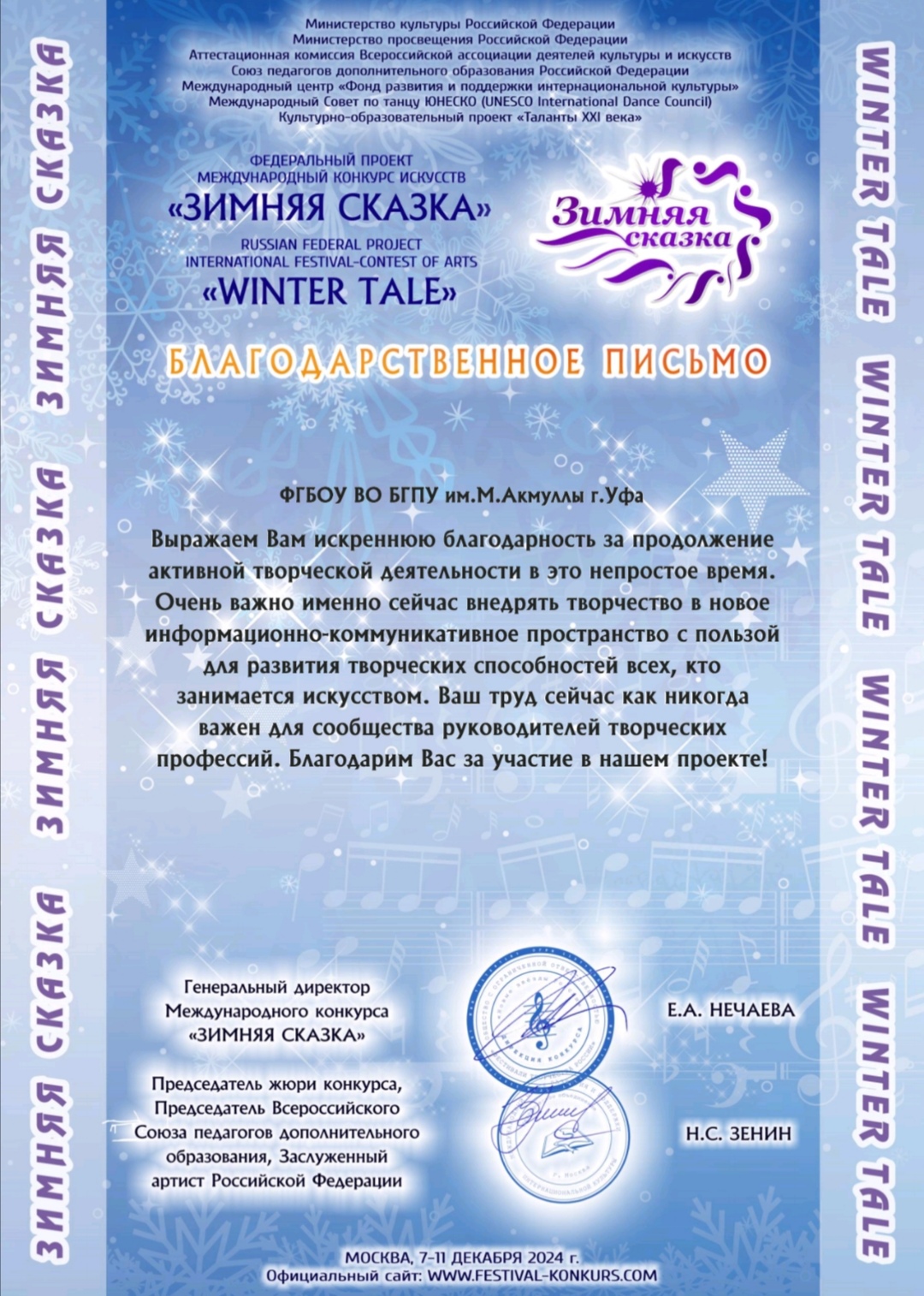В декабре 2024 года старший преподаватель кафедры музыкального и хореографического образования Камалиева Гульнара Раильевна приняла участие в Федеральном проекте Международный конкурс искусств «Зимняя сказка» в номинации «Инструментальная музыка» (фортепиано), организованного Министерством культуры РФ и Министерством просвещения РФ с 07.12.2024 г. по 11.12.2024 г.