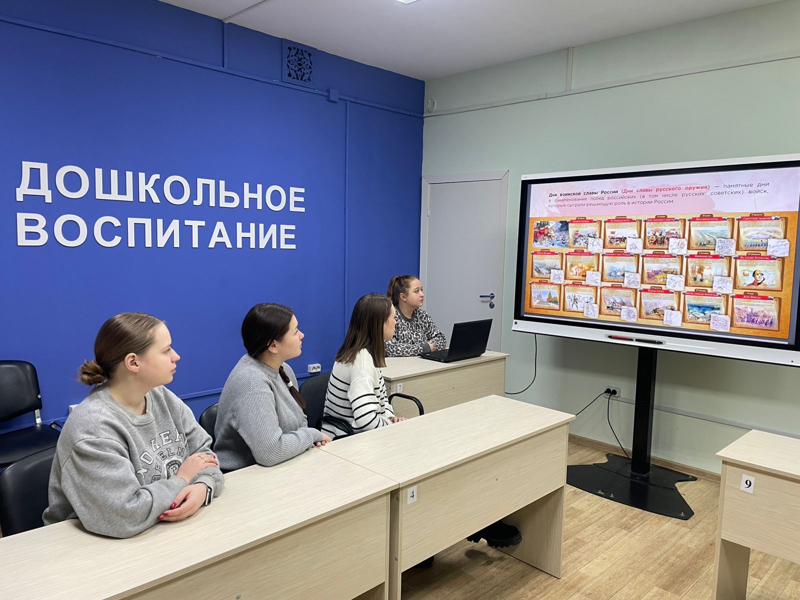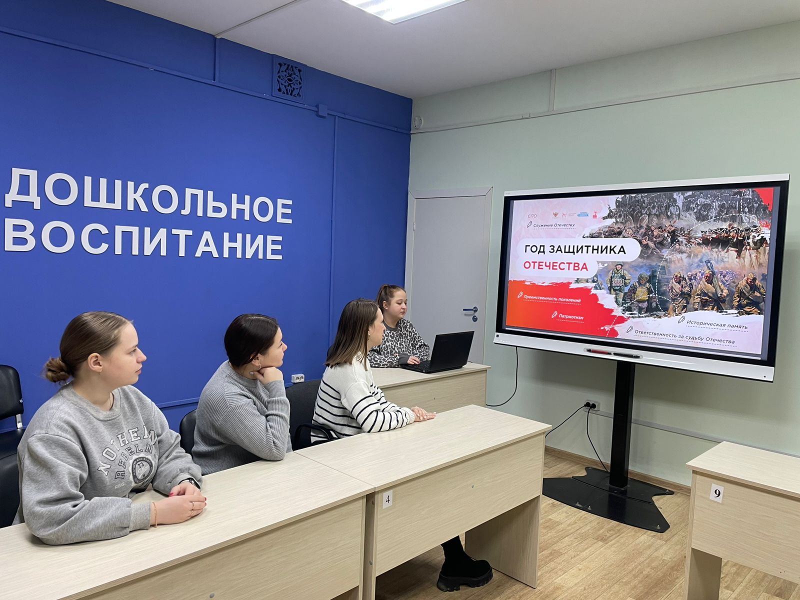 27 января 2025 года в рамках просветительских мероприятий Всероссийского проекта «Разговоры о важном!» для студентов, обучающихся по направлению «Педагогическое образование», профиль подготовки «Дошкольное образование» проведен тематический урок: «Год защитника Отечества». Сегодня вспомнили темы, связанные с признанием героизма и мужества воинов России, которые были рассмотрены ранее. Рассуждали над вопросом, как стремление защищать свое Отечество объединяет людей и почему героизм является характерной чертой наших сограждан? Мы знаем, что 2025 год – это год 80-летия Победы в Великой Отечественной войне. 1418 дней длилось это тяжелейшее, страшное противостояние. Приводили аргументы к вопросу, почему так важно спустя десятилетия продолжать чтить подвиг нашего народа, спасшего мир от фашизма? Интересным было участвовать в интерактивной викторине «Дни воинской славы России». Мы согласны с утверждением, что помнить о единстве народа, сплотившегося в драматические моменты нашей истории очень важно и конечно же надо делать все возможное для увековечения памяти об этих событиях и людях.