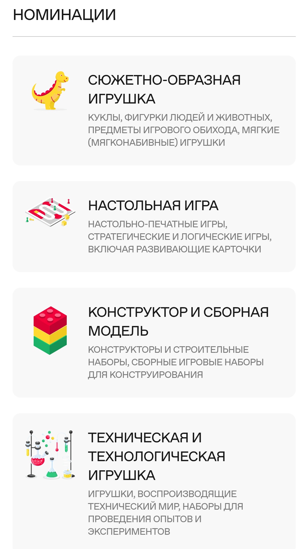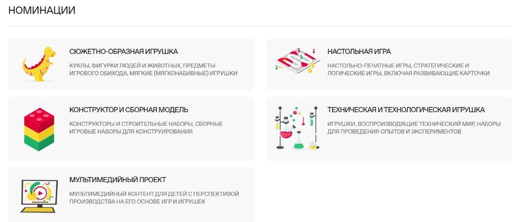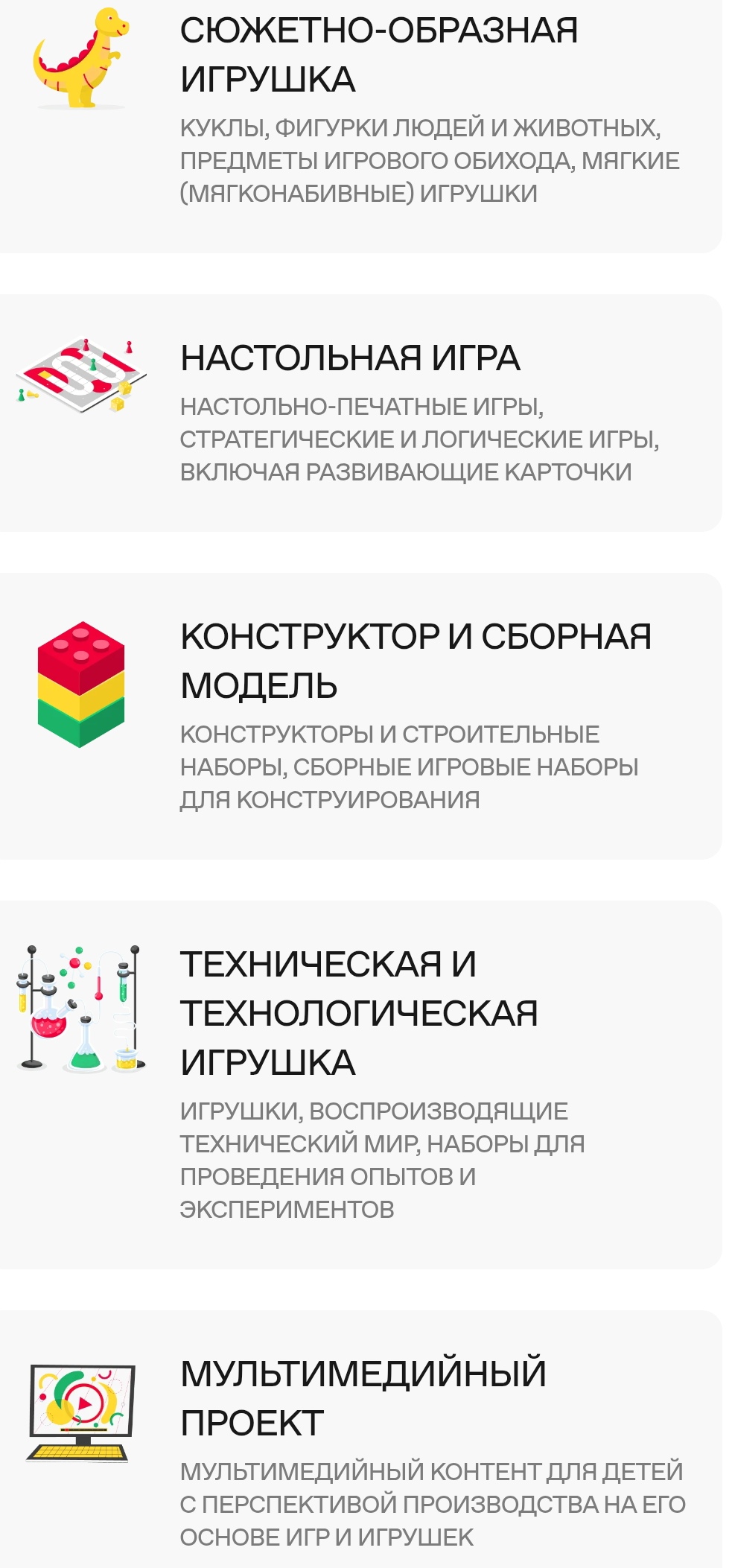В конкурсе могут участвовать как профессиональные производители, так и независимые авторы с 14 лет. Конкурс пройдет в пяти номинациях: «лучшая сюжетно-образная игрушка», «настольная игра», «техническая и технологическая игрушка», «конструкторы и сборные модели», «мультимедийный проект». На первом этапе будет отобрано 45 проектов, которые пройдут наставничество и получат рекомендации по дизайну и материалам. 15 проектов в каждой номинации выйдут в следующий этап и смогут создать рабочую версию.