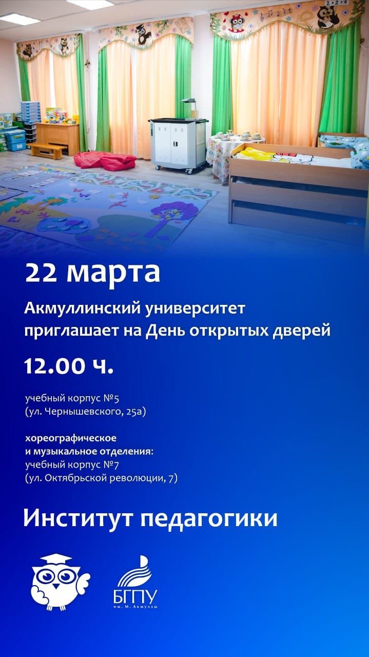 Институт педагогики Башкирского государственного педагогического университета им.М.Акмуллы приглашает учащихся, выпускников образовательных организаций и их родителей на День Открытых дверей!