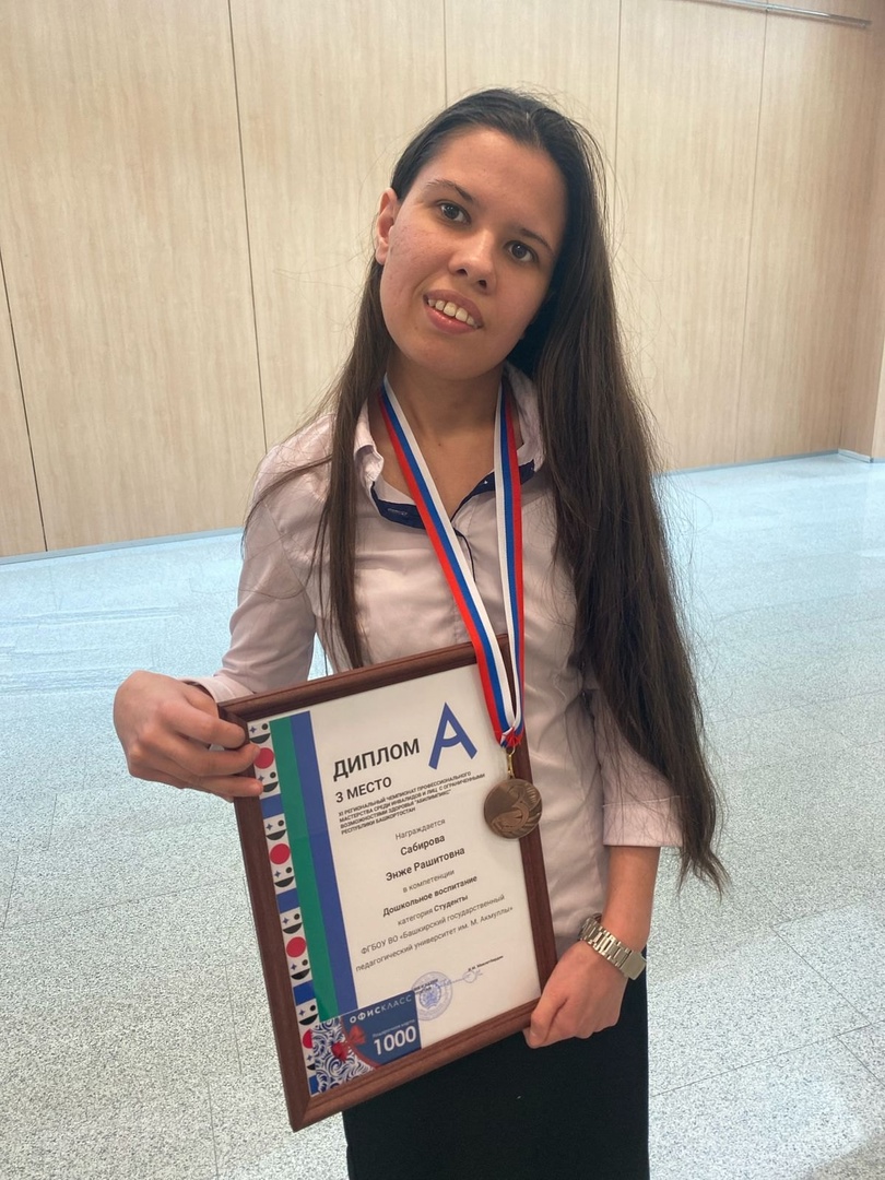 Среди участников чемпионата по дошкольному воспитанию студентка 4 курса Энже Сабирова  была удостоена Диплома 3 степени, а ее руководитель к.филос.н., доцент кафедры педагогики А.Х. Ахмедьянова - благодарственным письмом .