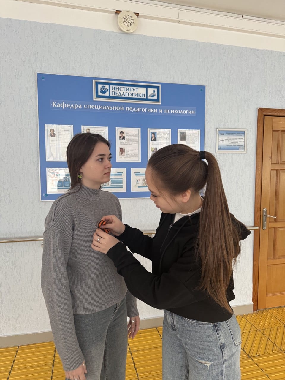 26 апреля 2025 года студенты и преподаватели Института педагогики приняли участие в  патриотической Всероссийской акции «Георгиевская лента»,  целью которой является формирование у граждан уважительного отношения к одному из символов воинской славы России – Георгиевской ленте, знаменующей героизм, мужество и стойкость народов нашего Отечества, подвигов защитников Отечества в ходе военных действий. Георгиевская ленточка - это знак героизма, доблести и славы защитников Отечества. Каждая полоска - чёрная как дым войны, оранжевая как пламя Победы - напоминает о тысячах жизней людей, отданных за наше будущее. Носить её у сердца - значит говорить: «Я помню! Я горжусь!»