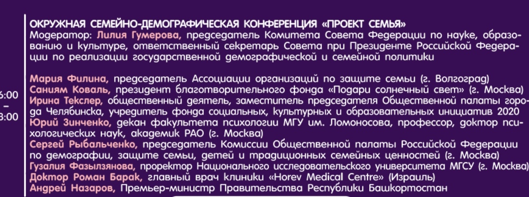 Модератором площадки выступила Председатель Комитета Совета Федерации Федерального Собрания Российской Федерации по науке, образованию и культуре, ответственный секретарь Совета Федерации Федерального Собрания Российской Федерации Лилия Гумерова, она подчеркнула, что проведение подобных мероприятий в регионах России положительно влияет на развитие института семьи.