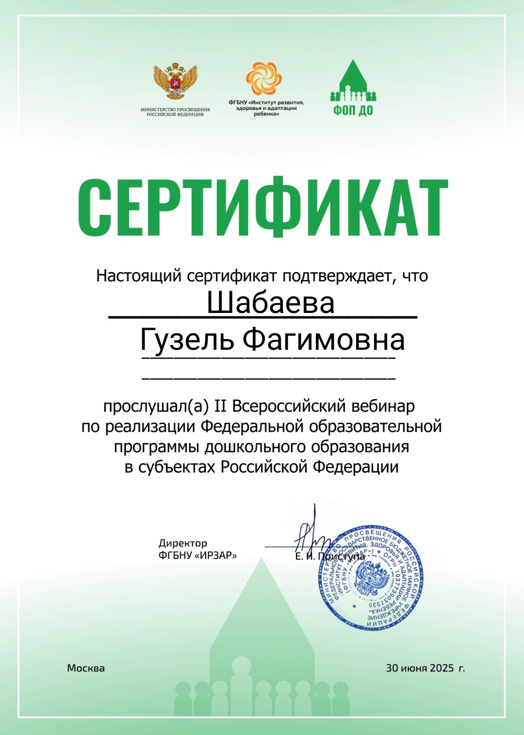 30 июня 2025 года  состоялся II Всероссийский вебинар по реализации Федеральной образовательной программы дошкольного образования в субъектах Российской Федерации.