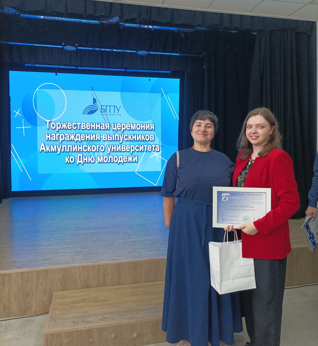 Накануне Дня молодежи в Акмуллинском университете состоялось традиционное награждение выпускников, отличившихся в научной, общественной, культурной и спортивной деятельности. Благодарственные письма из рук первого проректора по стратегическому развитию Алмаза Флюровтча Мустаева и проректора по молодежной политике и международным связям Радика Зиннатовича  Юлбаева получили 57 вчерашних студентов.