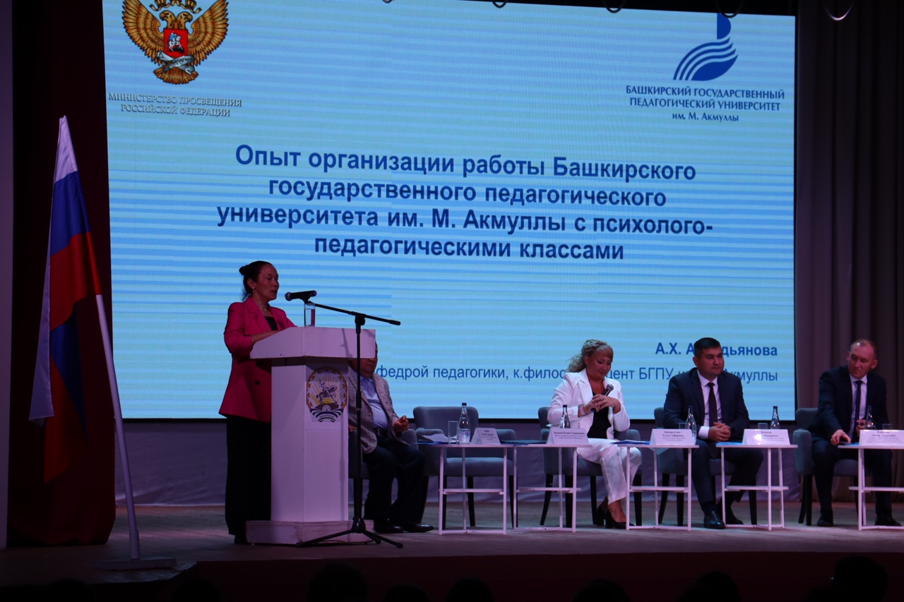 На конференции  доцент кафедры педагогики Алина Халиловна Ахмедьянова выступила с докладом  "Опыт организации работы Башкирского государственного педагогического университета им. М. Акмуллы с психолого-педагогическими классами". В рамках доклада был представлен опыт по активному привлечению  будущих абитуриентов в наш вуз, предложен проект сотрудничества со школами Гафурийского района.