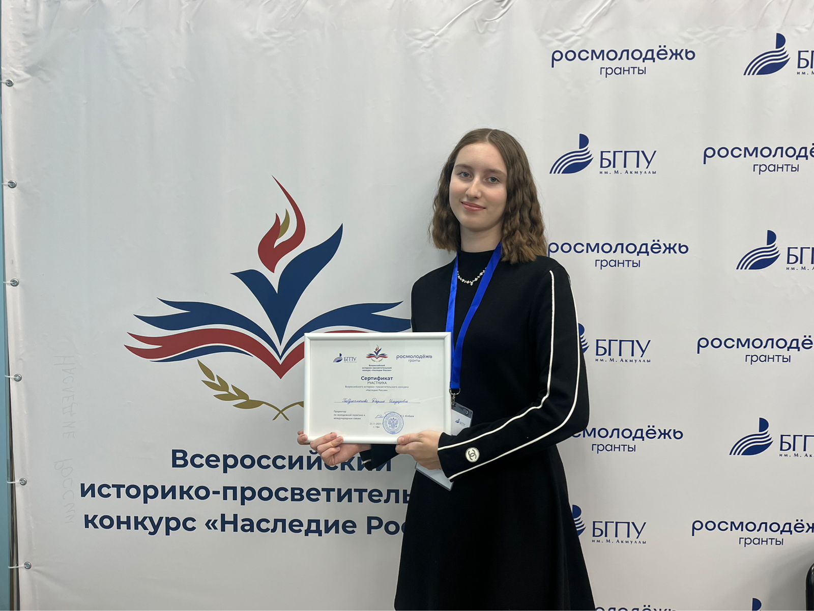 От души поздравляем Дарину Габдрахманову и ее научного руководителя канд.ист.наук, ст.преп. кафедры отечественной и всеобщей истории Алексея Олеговича Иванова  и желаем дальнейших профессиональных успехов и новых научных достижений!