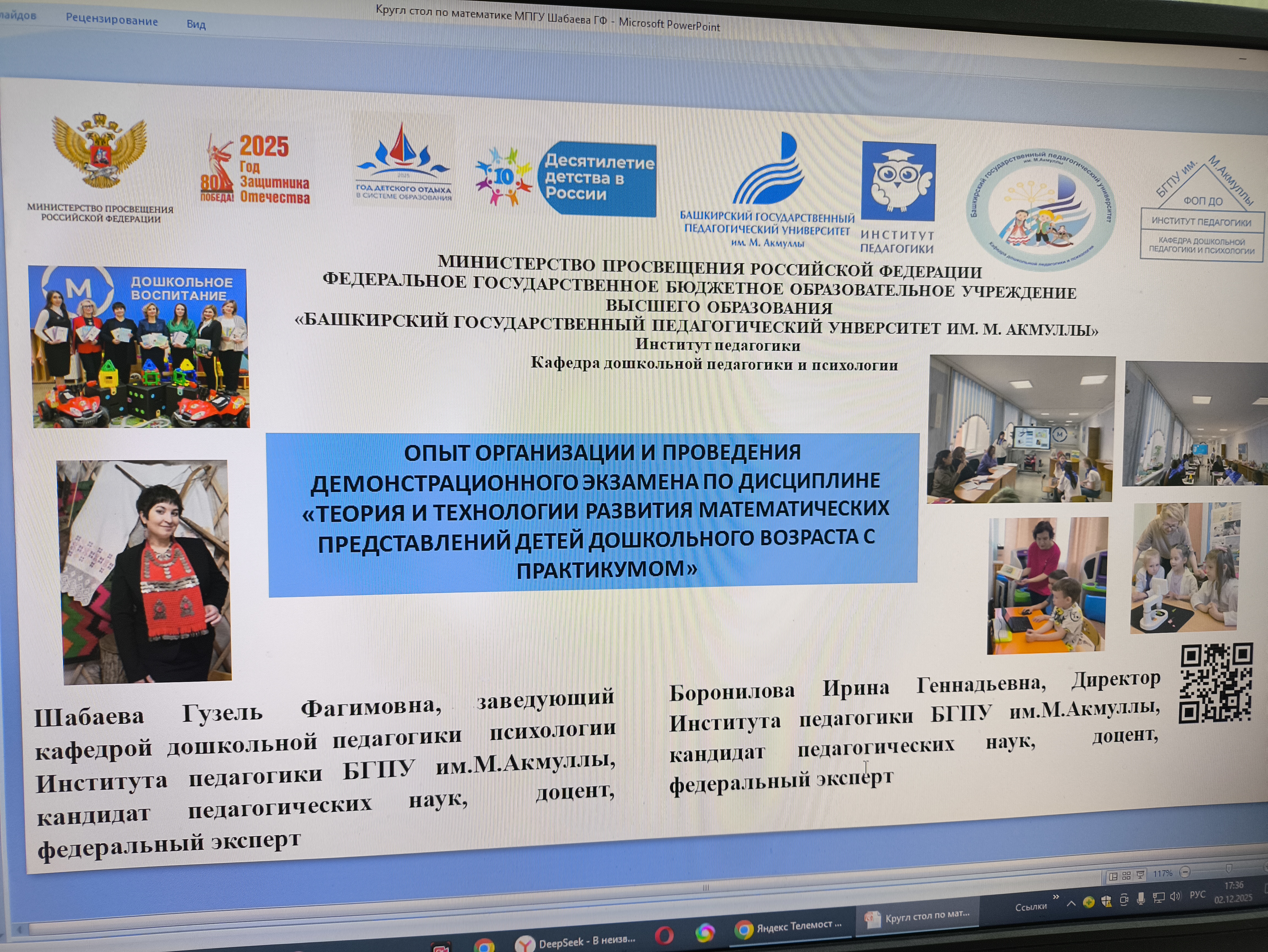 2.12.2025г. успешно прошла работа круглого стола по проблемам математического развития детей дошкольного возраста (в рамках дня математика) в МПГУ. Шабаева Г.Ф., заведующий кафедрой дошкольной педагогики и психологии, федеральный эксперт, к.п.н., доцент;