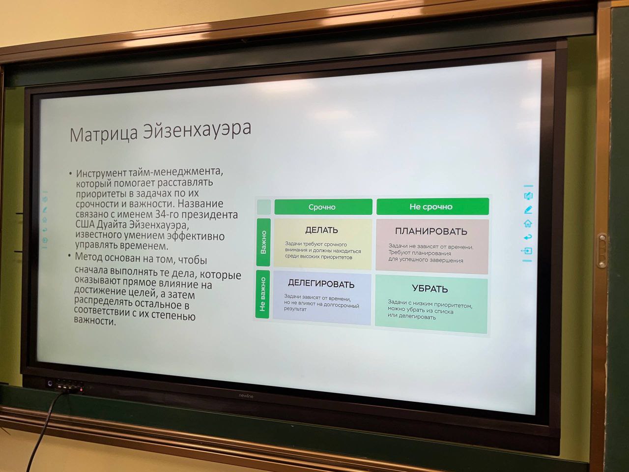 Особый акцент был сделан на матрице Эйзенхауэра. Студенты наглядно объяснили разницу между «срочным» и «важным», показав, что путь к успеху и снижению стресса лежит через фокус на квадранте 2: «Важные и несрочные» дела (учеба, хобби, здоровье, долгосрочные проекты). Именно по данной матрице было построено групповое практическое задание для учащихся. Каждая группа обдумывала, обсуждала и записывала в представленный шаблон матрицы 5-7 своих актуальных задач: от подготовки к контрольной и уборки дома до похода в кино с друзьями.