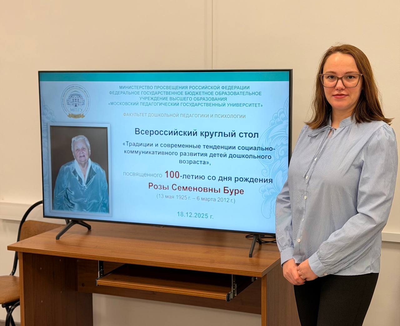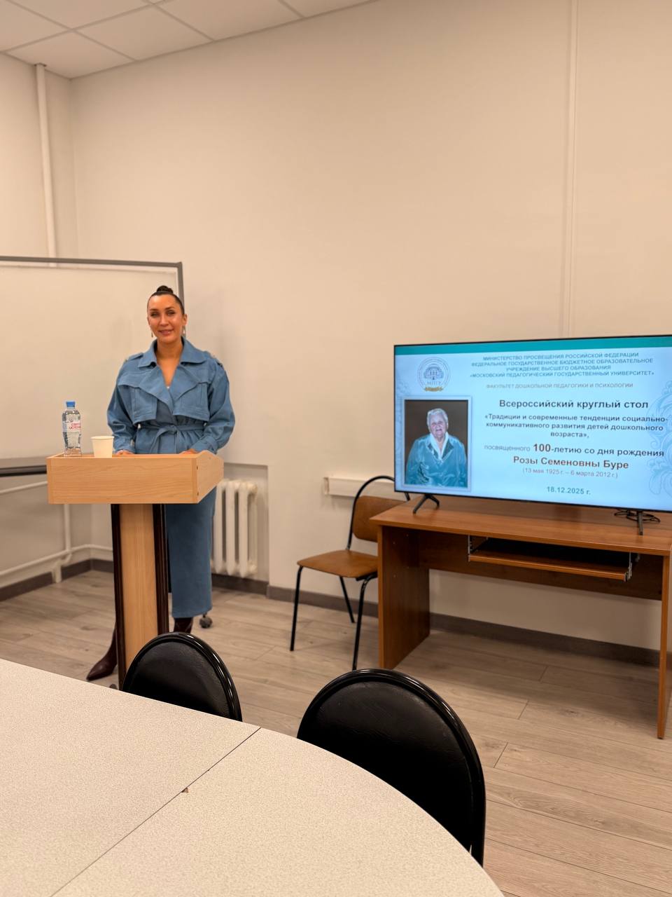 18.12.2025г. старший преподаватель кафедры дошкольной педагогики и психологии Калмыкова Татьяна Сергеевна и преподаватель кафедры дошкольной педагогики и психологии Кинцель Валентина Николаевна приняли участие во Всероссийском круглом столе «Традиции и современные тенденции социально-коммуникативного развития детей дошкольного возраста», посвященного 100-летию со дня рождения Розы Семеновны Буре организованной Факультетом дошкольной педагогики и психологии ФГБОУ ВО «Московского педагогического государственного университета». Цель круглого стола - обсуждение научного наследия Р.С. Буре в контексте вызовов современного образования, обмен практическим опытом и определение перспективных векторов работы по социально-коммуникативному развитию детей дошкольного возраста.