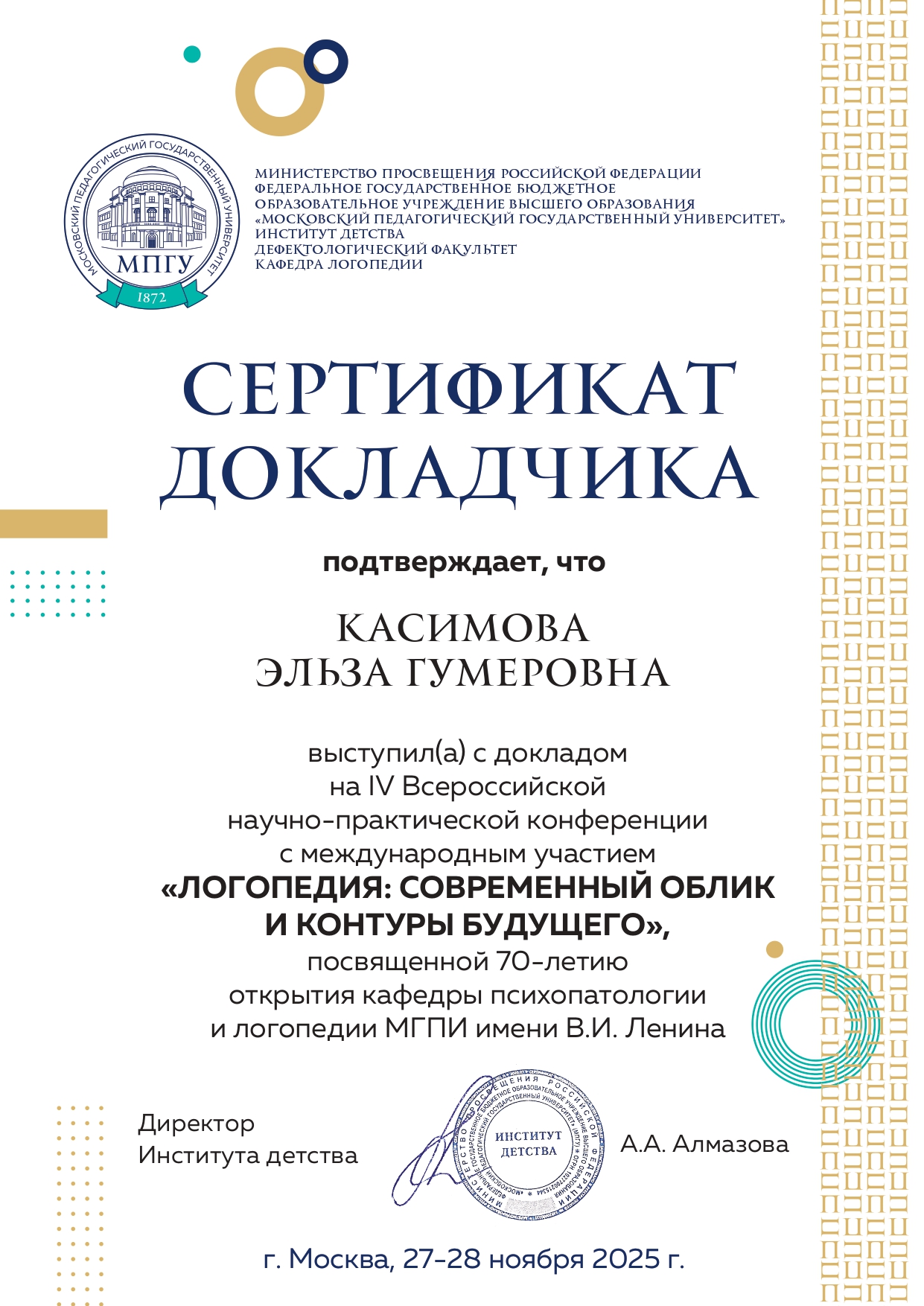 27-28 ноября 2025 года состоялась IV Всероссийская научно-практическая конференция с международным участием «ЛОГОПЕДИЯ: СОВРЕМЕННЫЙ ОБЛИК И КОНТУРЫ БУДУЩЕГО», посвященная 70-летию открытия кафедры психопатологии и логопедии МГПИ имени В.И. Ленина.