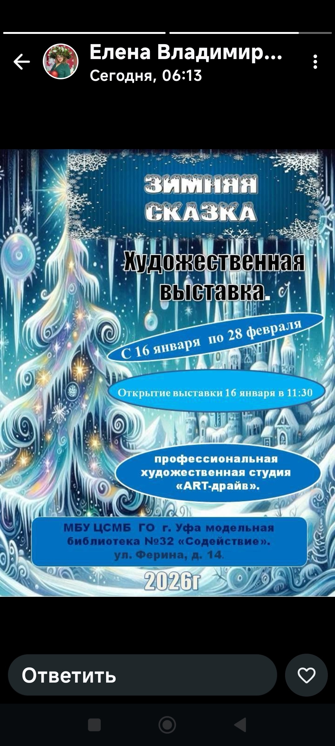 Профессиональная художественная студия «ART-драйв» под руководством Елены Пуртовой 16 января начала новый год с замечательного события — открытия выставки детских работ «Зимняя сказка» в Библиотеке № 32 в Инорсе Калининского района г. Уфа!