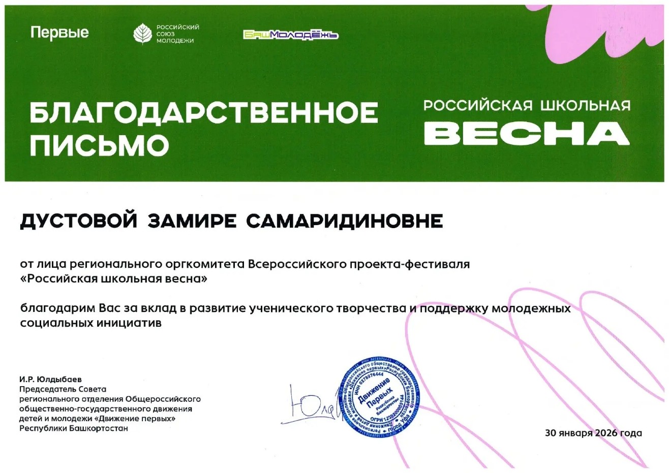 По итогам работы Замире Самаридиновне и Карине Салминой было вручено Благодарственное письмо за вклад в развитие ученического творчества и поддержку молодежных социальных инициатив.