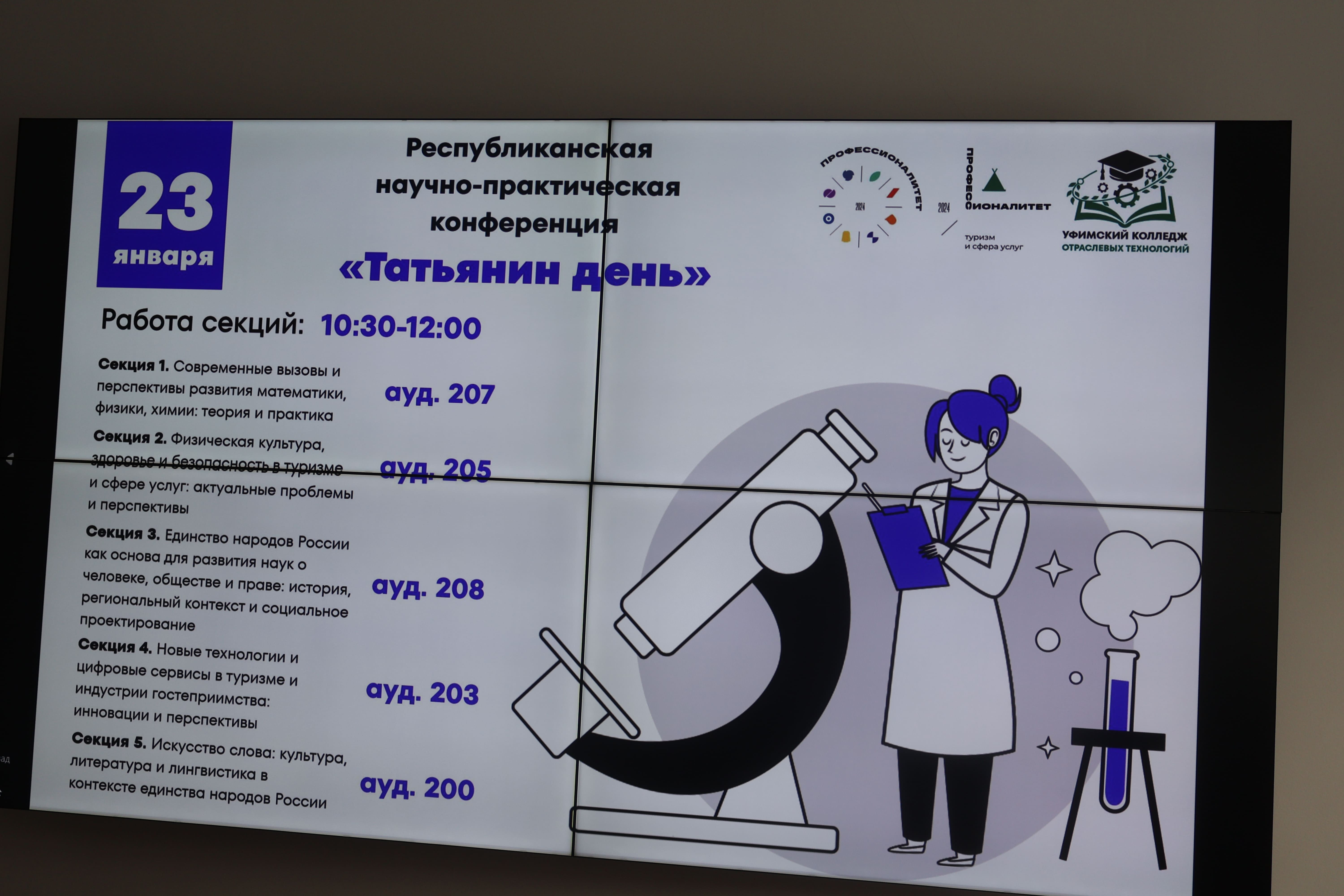 В Уфимском колледже отраслевых технологий прошла Республиканская научно-практическая конференция, посвященная студенческому празднику Татьянин день. Свои доклады представили студенты разных образовательных организаций города Уфы и Республики Башкортостан.