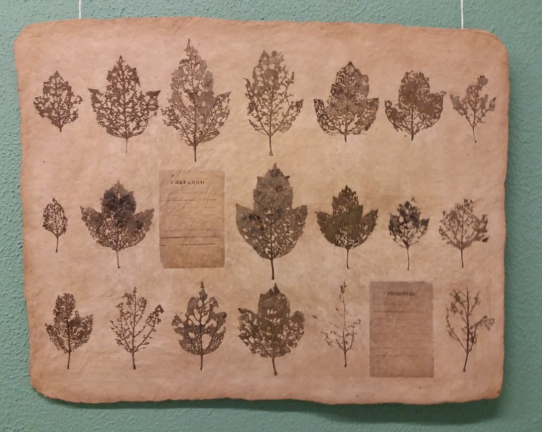 Егор Гришин: Работа Рината Миннебаева называется "Луговые мари". Я думаю, что автор хочет рассказать нам о древних верованиях марийцев. Марийская религия основывается на вере в силы природы, которые человек должен почитать и уважать. Мари считают себя детьми природы, молятся они в лесу в специально отведенных местах, которые называются рощами. На природе они себя чувствуют как бы ее частью, общение с богом проходит через дерево. Марийцы рассматривают рощу как место временного обитания богов, как сакральную территорию, в пределах которой возможен контакт человека с богом. На работе Р.Миннебаева изображены листья и записки о здравии и упокоении. Листья символизируют древние священные рощи марийцев, а записки - две главные молитвы: о здравии живых и упокоении ушедших близких. Если посчитать количество листьев перед каждой запиской, мы можем заметить, что их ровно девять. Во многих культурах число девять связанно с представлением о небесах. Также девятка олицетворяет цикличность и постоянство. А один лист после записки о упокоении символизирует начало всего. Мари верили в то, что как весна, лето, осень и зима постоянно рождаются, умирают и возвращаются в человеческий мир, то же самое происходит и с самими людьми: они могут рождаться, умирать и снова возвращаться на землю. Душа человека возвращается в материальный мир в новых воплощениях.