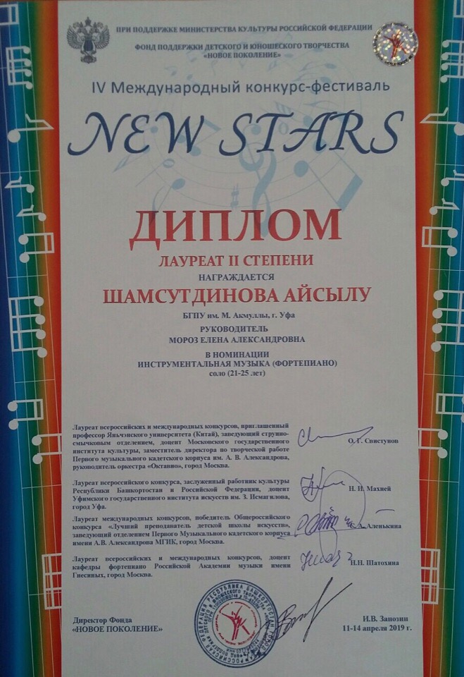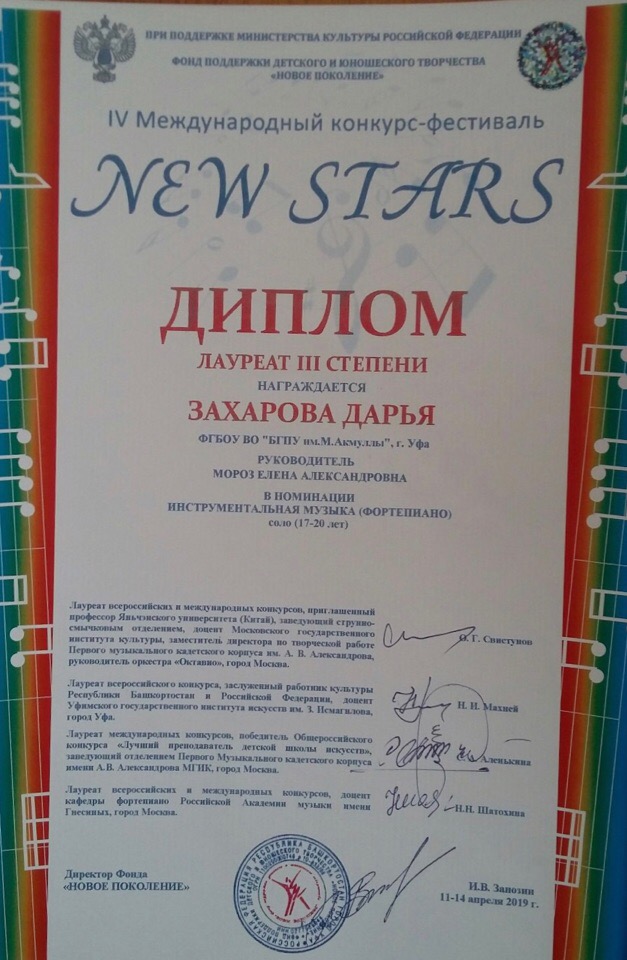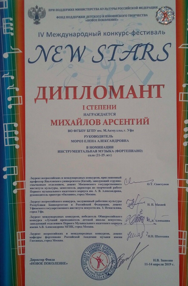 В апреле 2019 года студенты-музыканты БГПУ им. М. Акмуллы (класс заслуженного артиста РФ, профессора Елены Александровны Мороз) приняли участие в IV Международном конкурсе-фестивале «New stars» в рамках проекта «Лучший из лучших», организованном при поддержке Министерства культуры РФ и Фонда поддержки детского и юношеского творчества «Новое поколение».