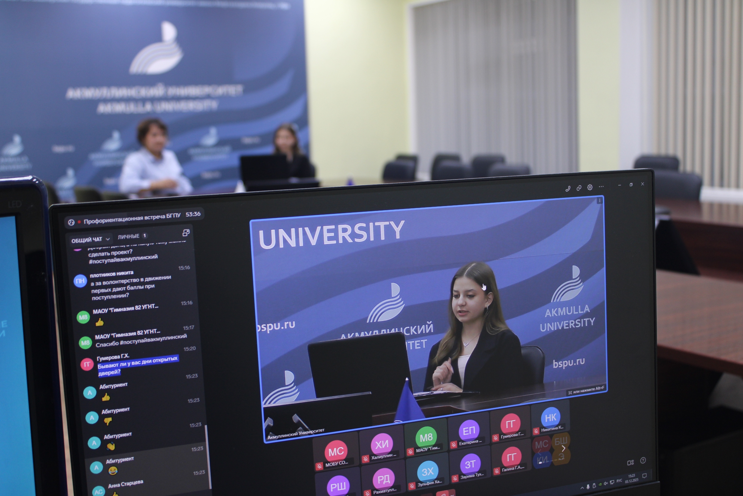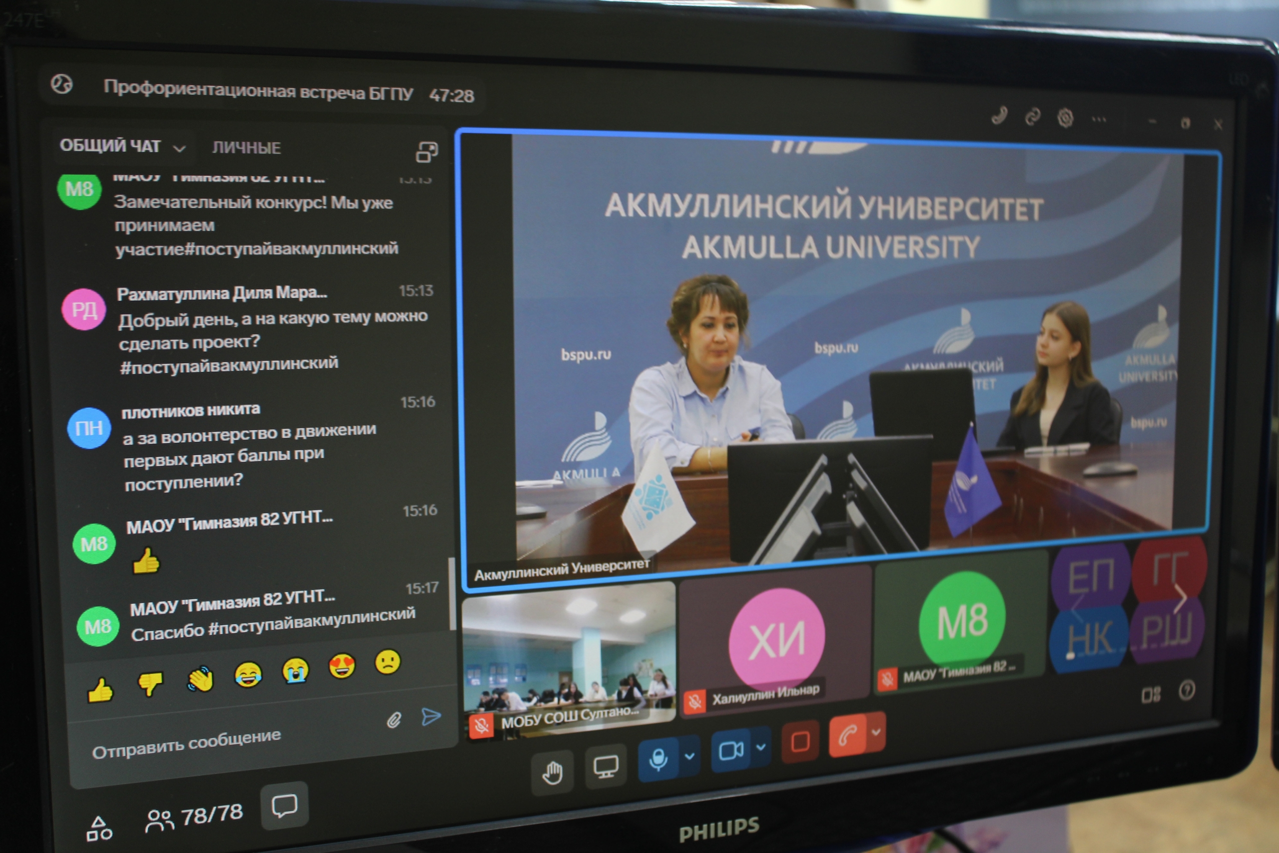 В прямом эфире перед ними выступили представители Акмуллинского университета. Алмаз Мустаев, первый проректор по стратегическому развитию, рассказал о стратегических векторах развития вуза, возможностях и  перспективах, которые открывает обучение здесь. Заместитель ответственного секретаря приемной комиссии Наталья Газизова детально разобрала актуальные правила приема в университет в 2026 году, подробно остановилась на целевом обучении и существующих льготах. Эльвира Шаймухаметова, куратор Акмуллинских классов, осветила уникальные возможности получить дополнительные баллы, которые дает будущим абитуриента БГПУ имени М. Акмуллы.