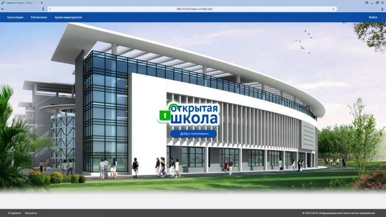 Для реализации работы в данном направлении информационно-техническим управлением разработана концепция проекта «Открытая школа», в логике которой сотрудниками отдела модернизирован сайт проекта расположенный по адресу http://school.bspu.ru. На сайте организованы онлайн-трансляции уроков в соответствии с единым республиканским расписанием, представлен архив уроков для доступа к учебным материалам в любое время. Интерфейс ресурса специально спроектирован максимально простым, главная страница - это визуализации здания инновационной школы, а страница выбора класса трансляции выполнена в виде дверей в учебные кабинеты, что в совокупности переносит обучающегося в процесс обучения.