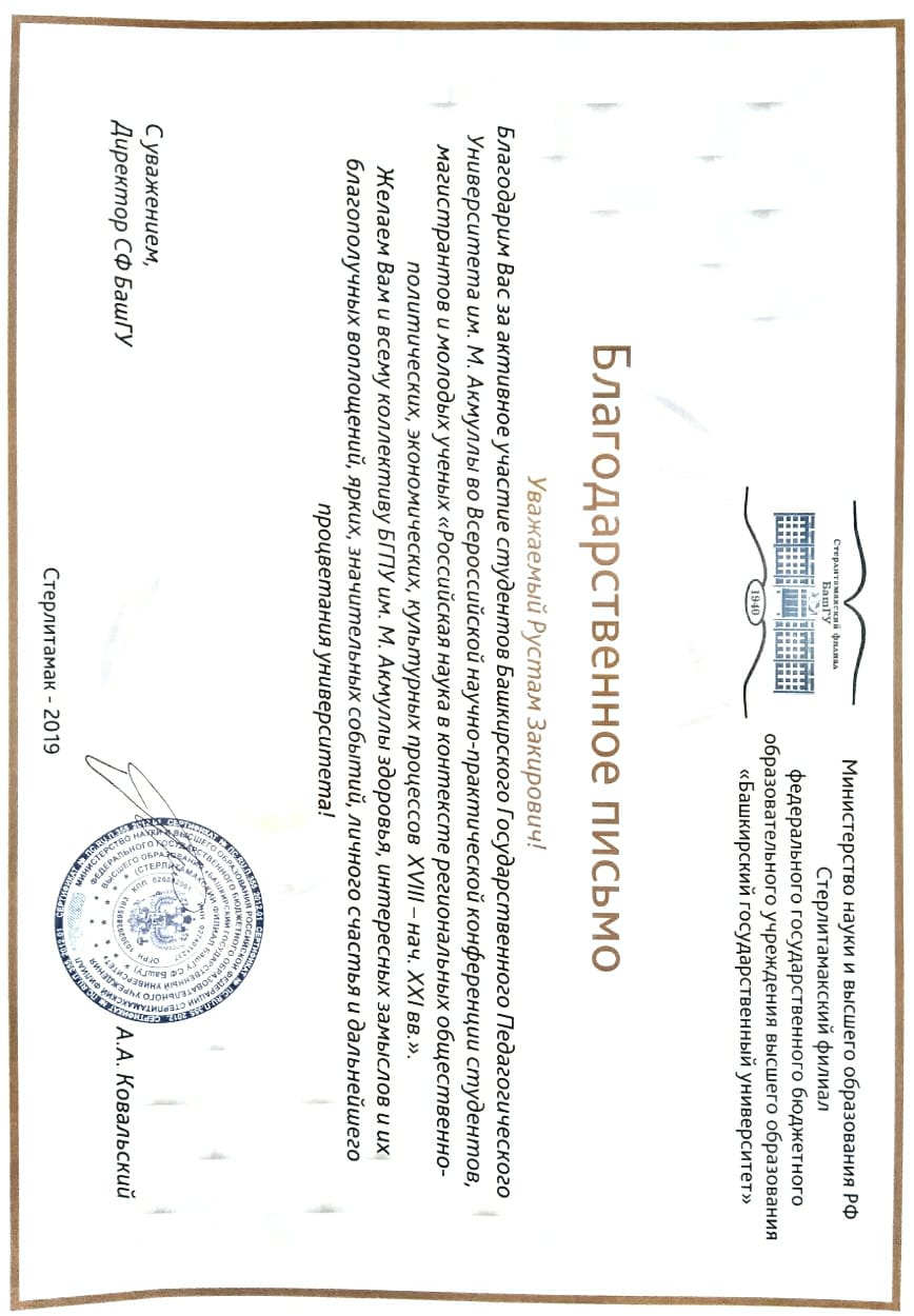 6 декабря 2019 года на базе исторического факультета Стерлитамакского филиала Башкирского государственного университета состоялась Всероссийская студенческая научно-практическая конференция «Российская наука в контексте региональных общественно-политических, экономических, культурных процессов XVIII-начала XXI вв.».