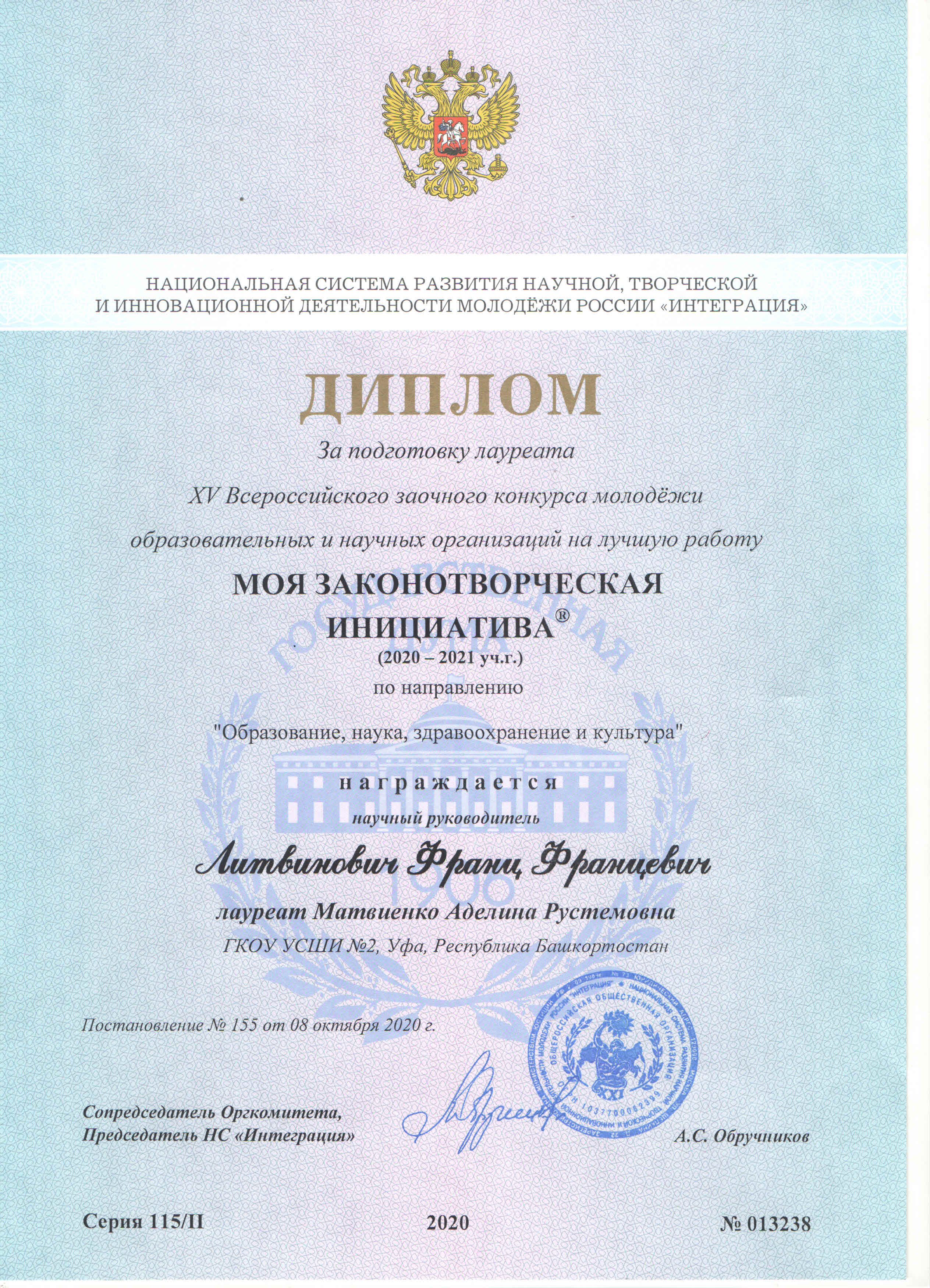 Канд.юрид.наук, доцент кафедры права и обществознания Франц Францевич Литвинович награжден дипломами за подготовку лауреата заочного и призера очного этапа Матвиенко Аделины Рустемовны XV Всероссийского конкурса молодежи образовательных и научных организаций на лучшую работу «Моя законотворческая инициатива» по направлению «Образование, наука, здравоохранение и культура».